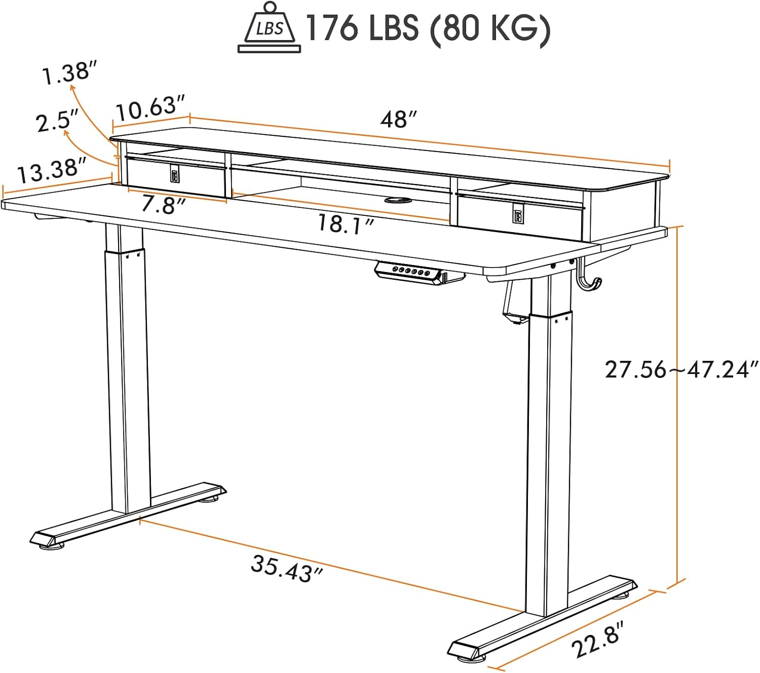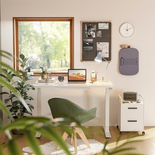 FEZIBO Electric Standing Desk with Double Drawers, 48 x 24 Inch Glass Top Monitor Stand Adjustable Sit Stand Desk with Storage Shelf, White Frame/LightWalnut Top