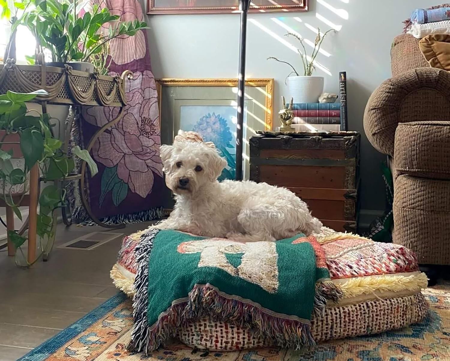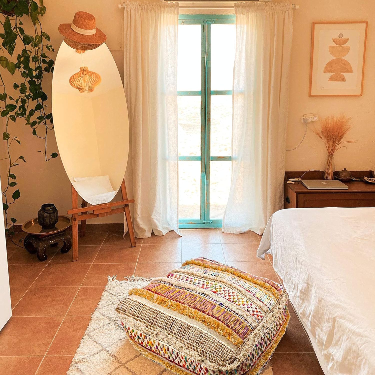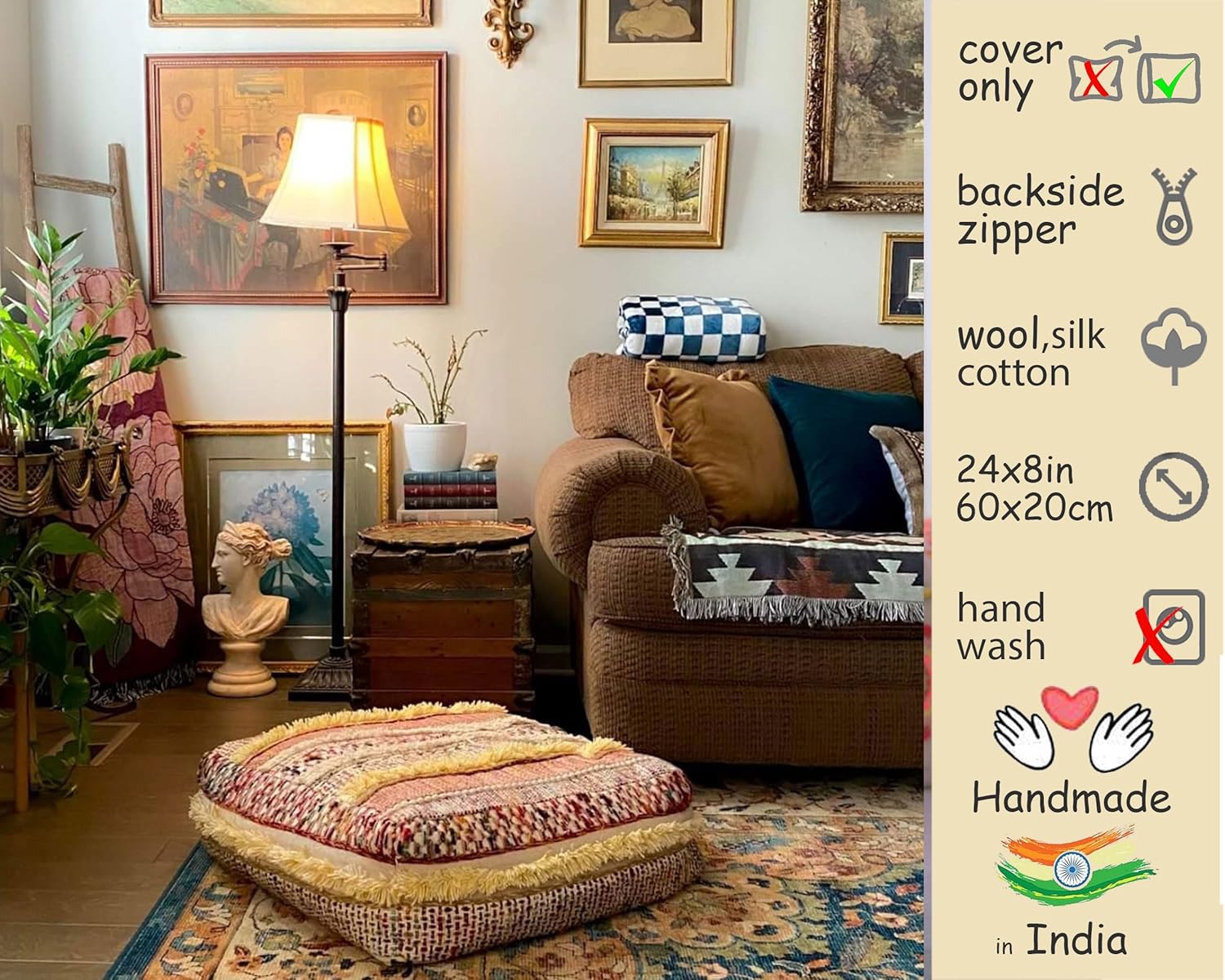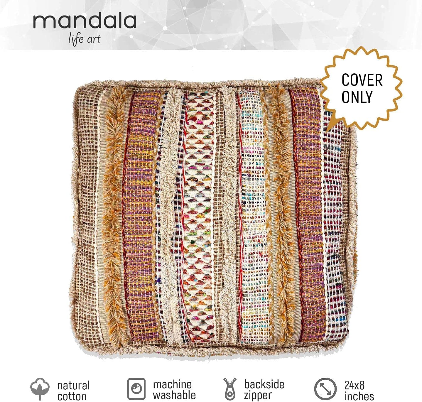 Mandala Life ART Bohemian Floor Cushion Cover - Pure Wool and Cotton Mix - 24x24x8 inches -Filler not Included - Artisan Hand Embroidery Patch Work - Boho Chic Luxury Moroccan Pouf Cover