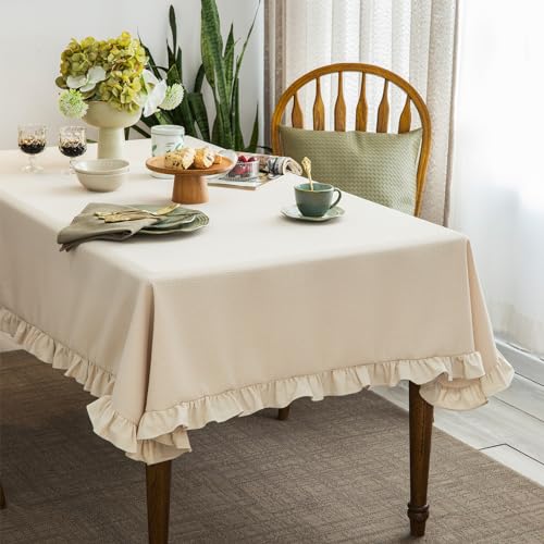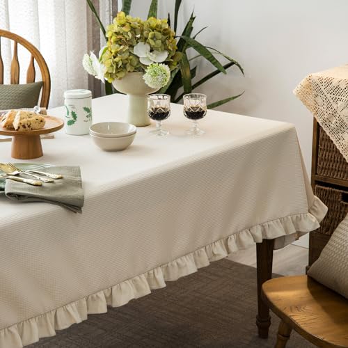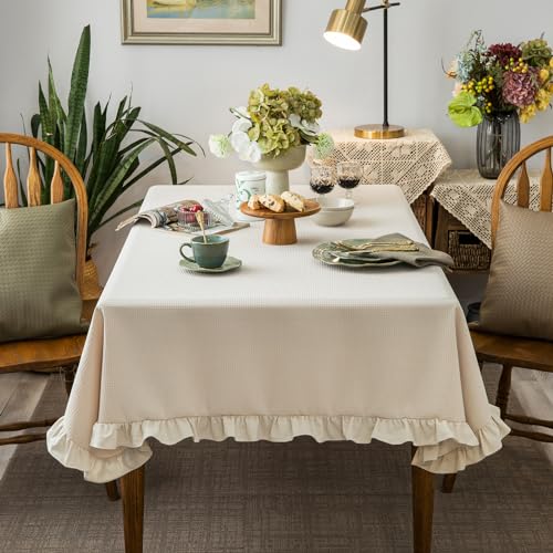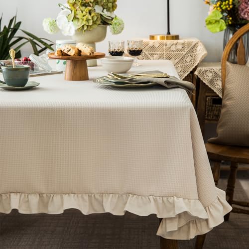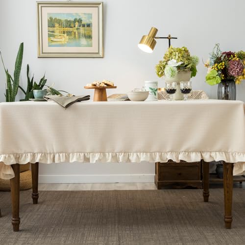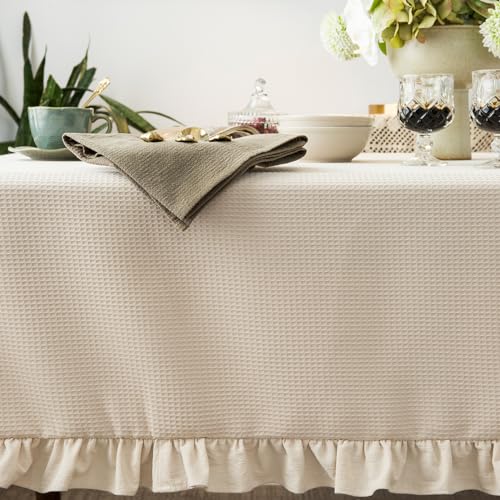 Waffle Weave Textured Rectangle/Oblong Tablecloth with Cotton Retro Ruffle Trim Solid Table Cover for Buffet Banquet Parties Event Holiday Kitchen Dining Farmhouse Decor Pea Green 55x84 Inches