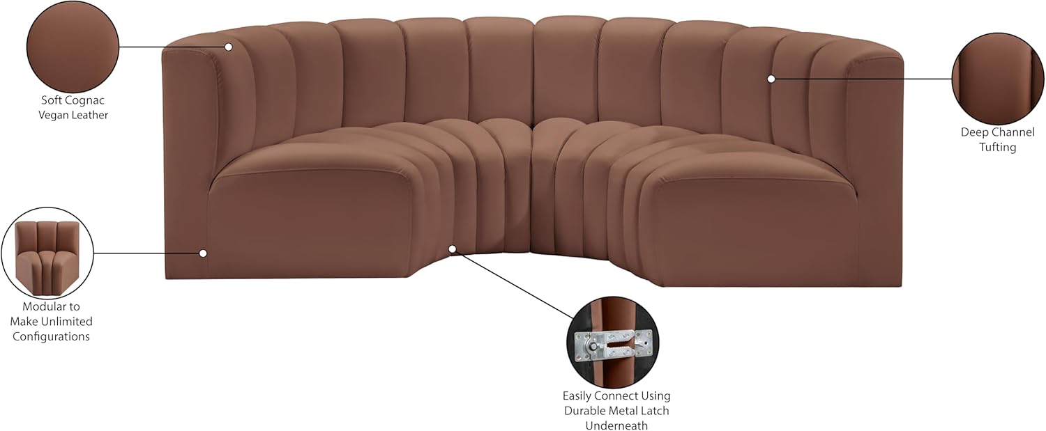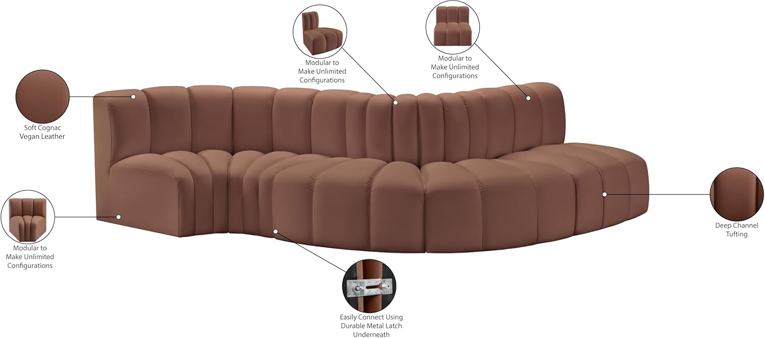Meridian Furniture Arc Collection Modern | Contemporary Sofa with Soft Vegan Leather, Deep Channel Tufting, Modular, 122" W x 52" D x 30" H, Cognac