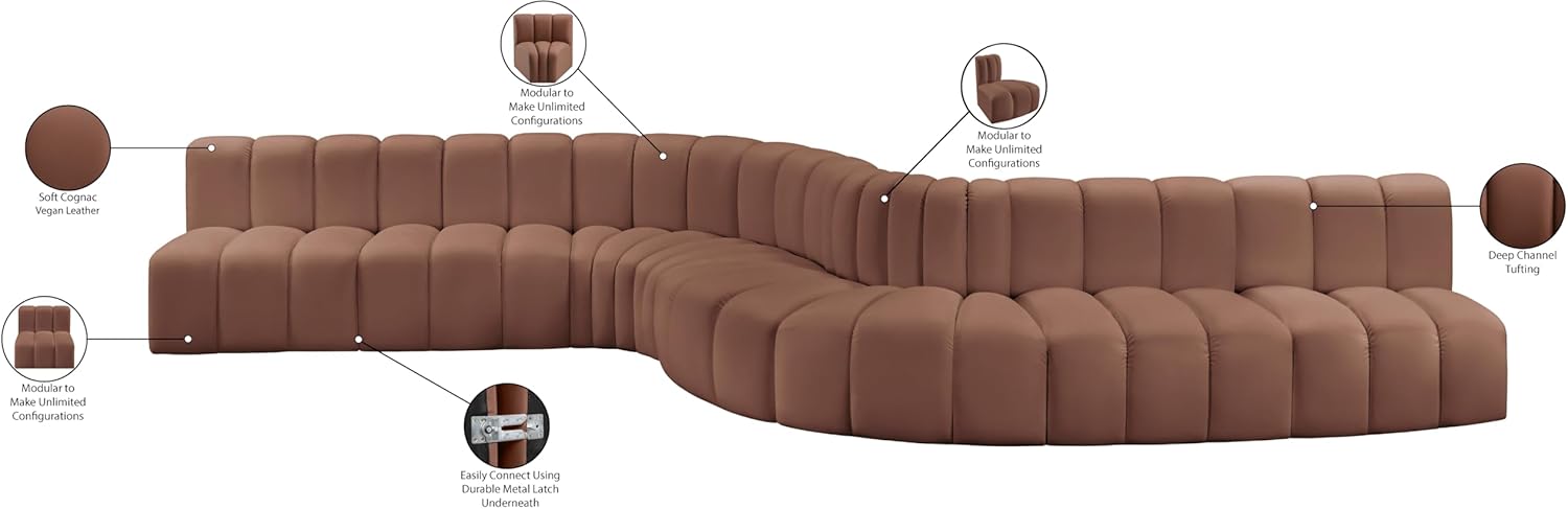 Meridian Furniture Arc Collection Modern | Contemporary Sofa with Soft Vegan Leather, Deep Channel Tufting, Modular, 197" W x 84" D x 30" H, Cognac
