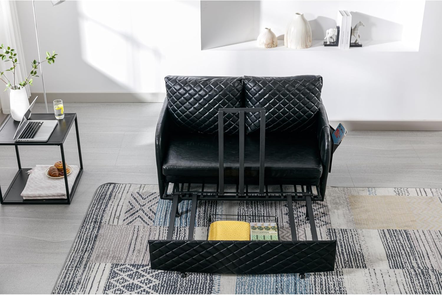 Black 47.64" Modern Convertible Sleeper Loveseat Sofa Bed Solid Contemporary Leather Removable Cushions Storage