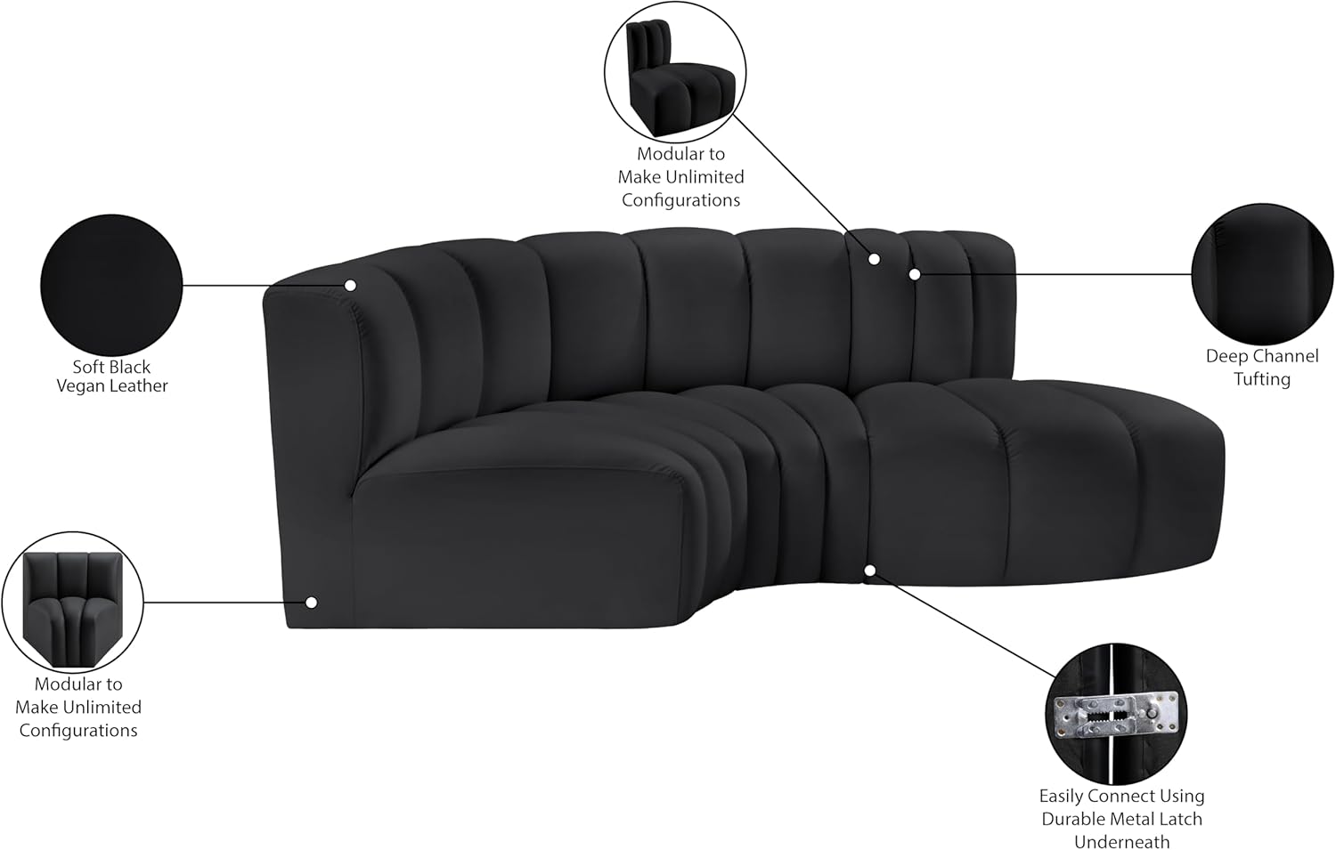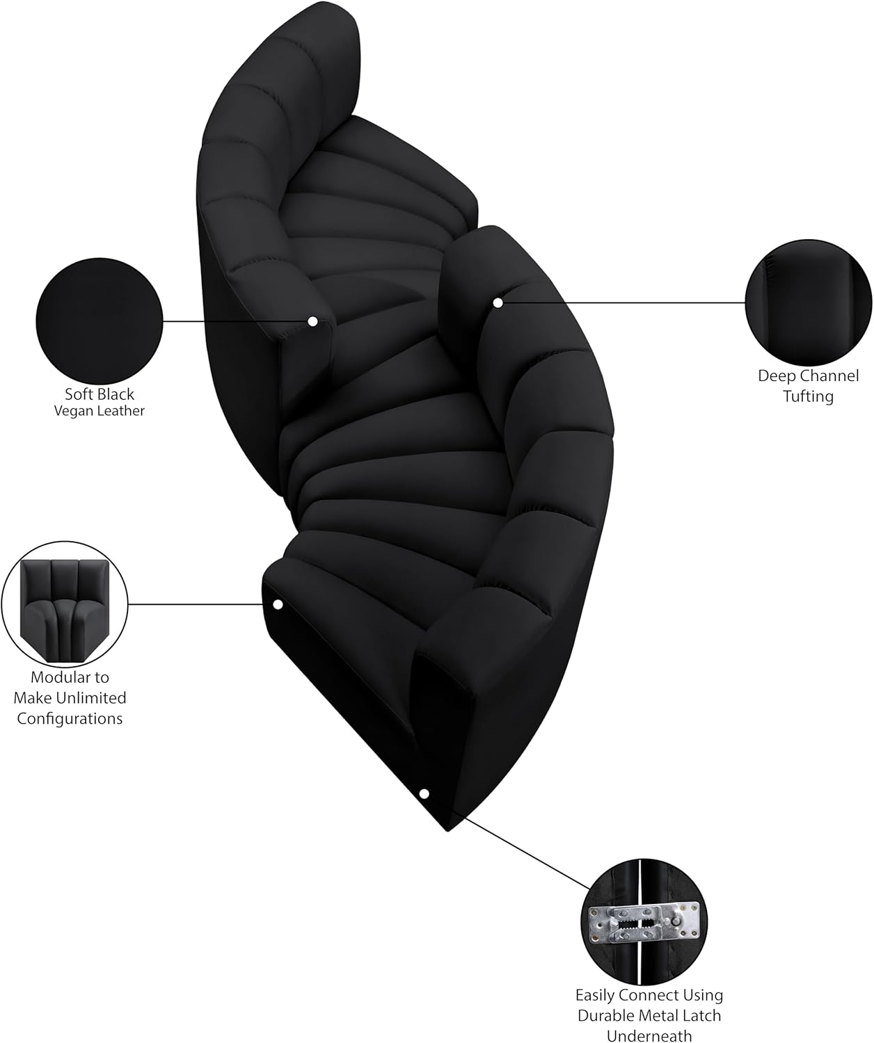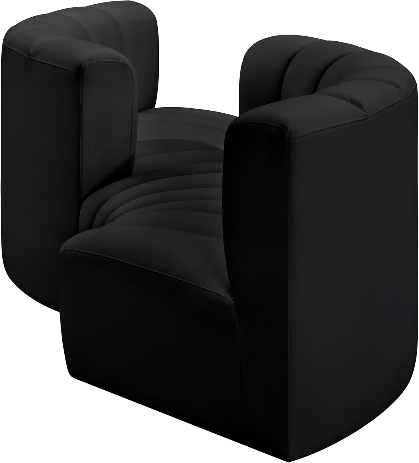 Meridian Furniture Arc Collection Modern | Contemporary Sofa with Soft Vegan Leather, Deep Channel Tufting, Modular, 102" W x 36" D x 30" H, Black