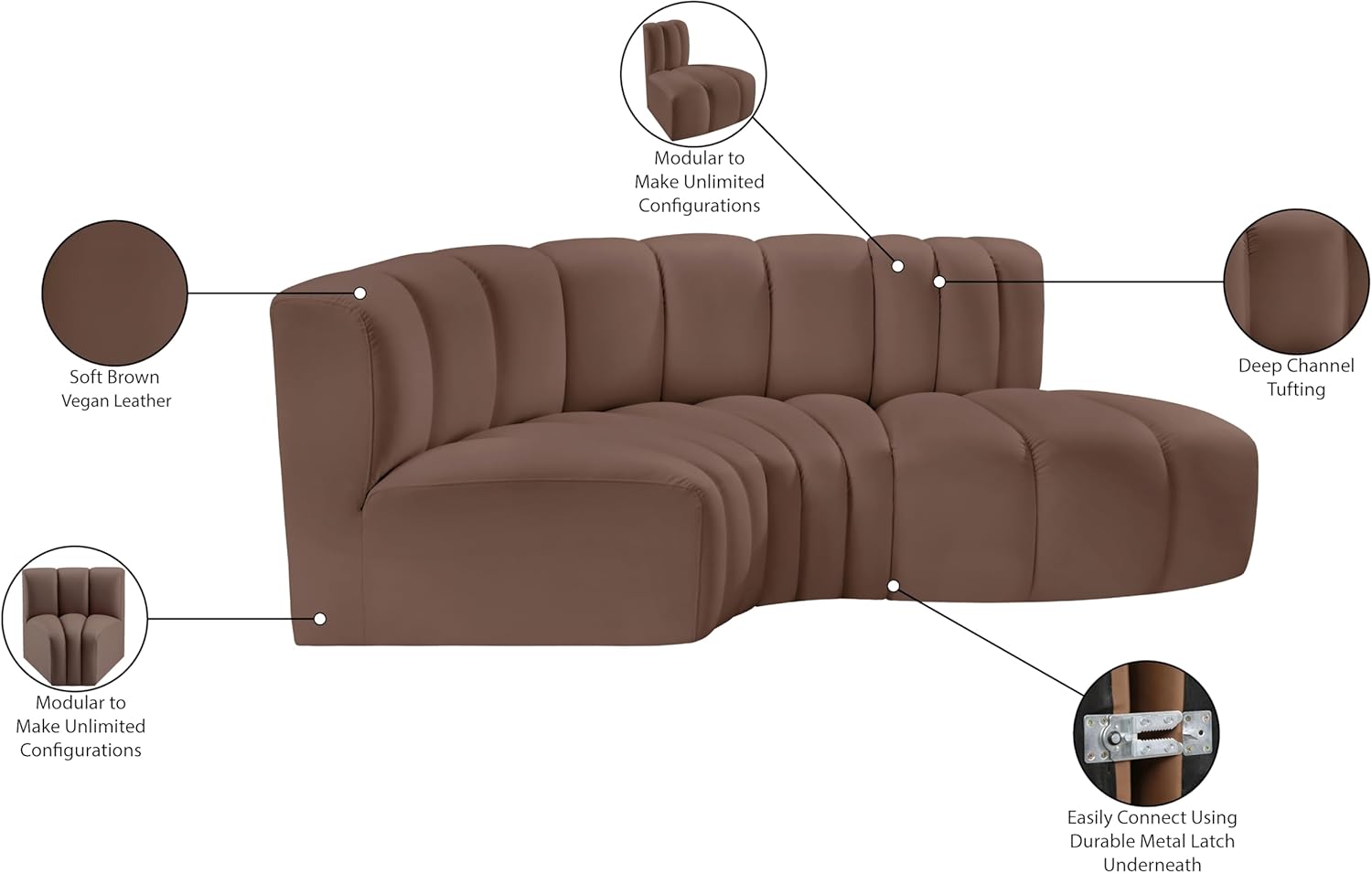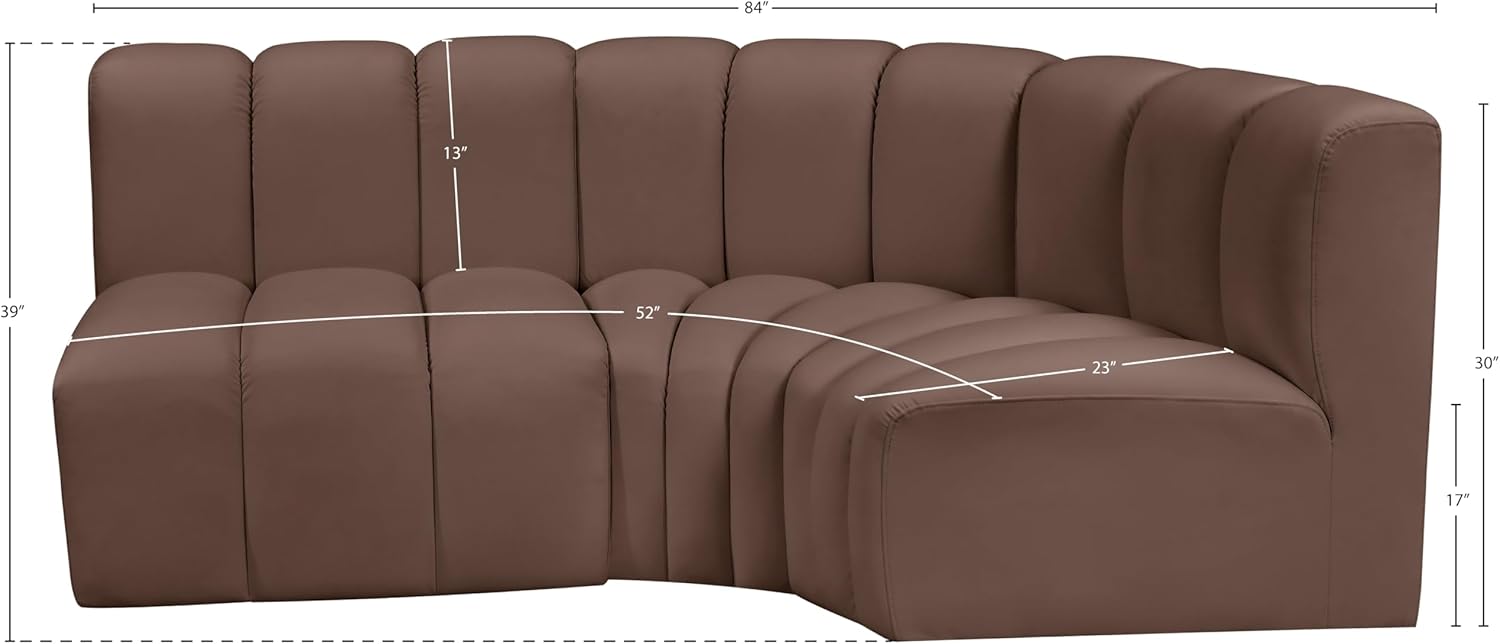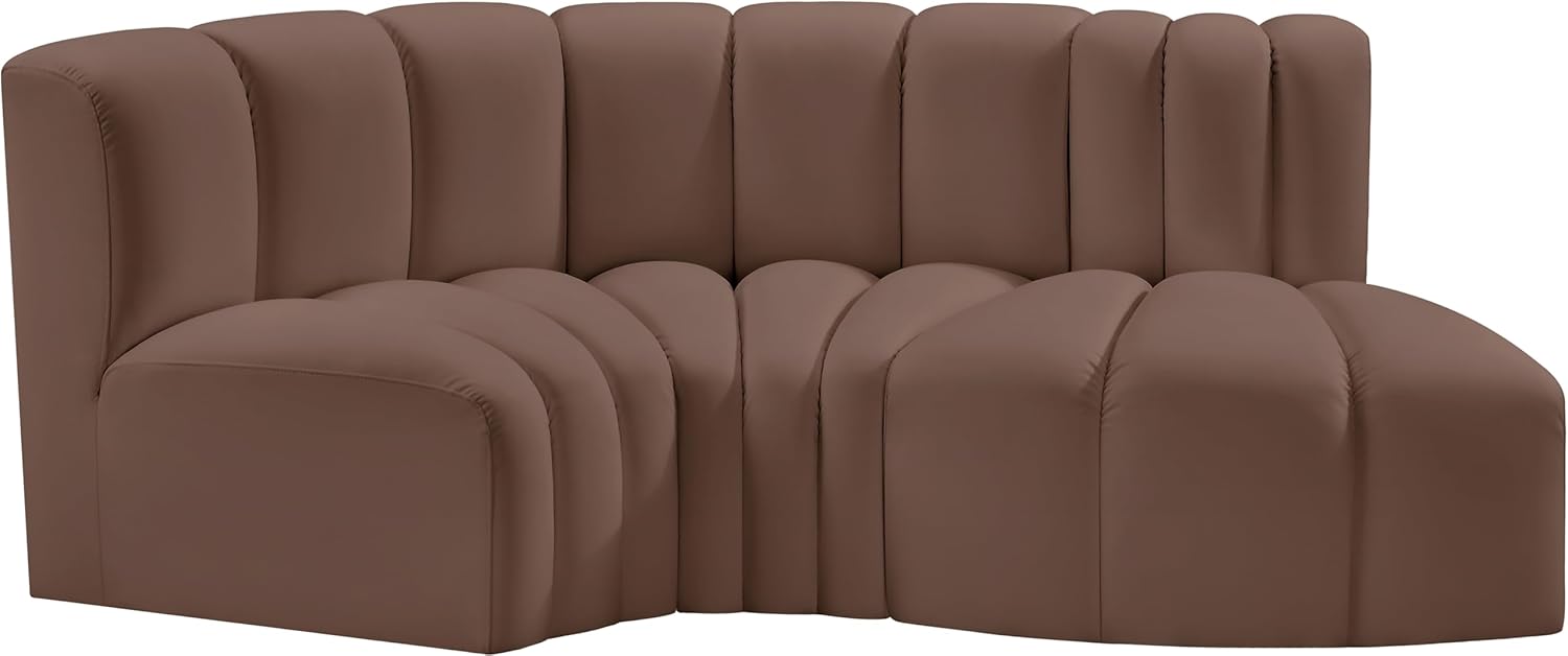 Meridian Furniture Arc Collection Modern | Contemporary Sofa with Soft Vegan Leather, Deep Channel Tufting, Modular, 84" W x 39" D x 30" H, Brown