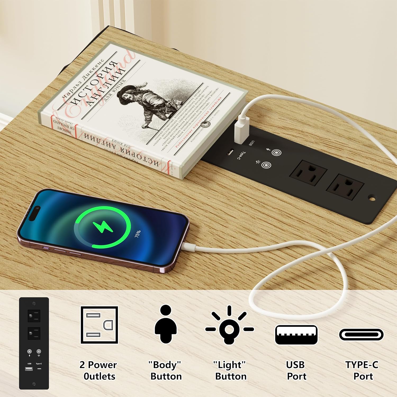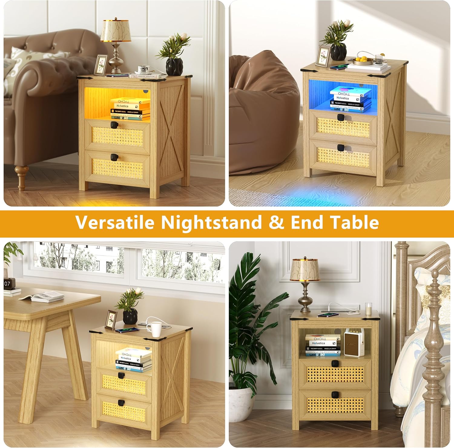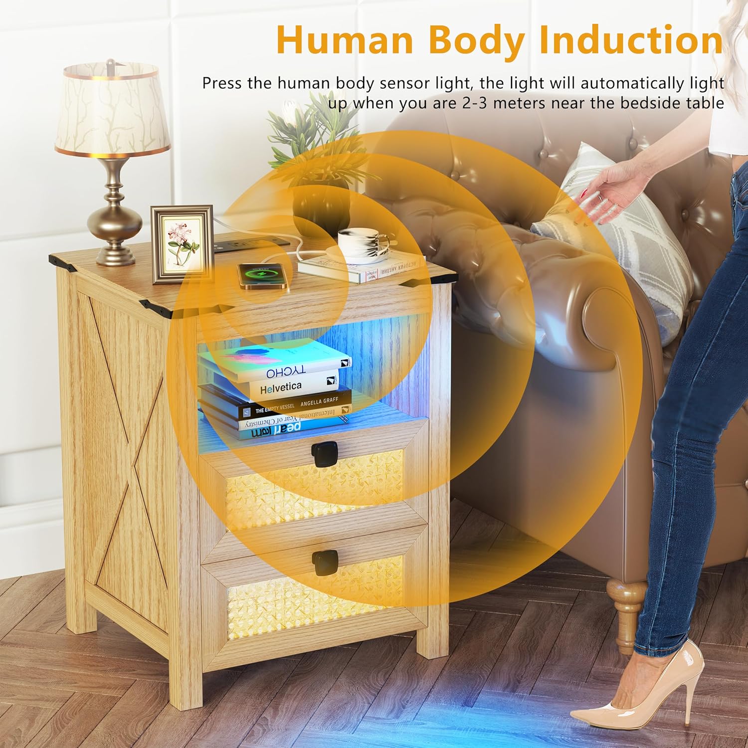 Modern Nightstand Set of 2, Nightstand with Charging Station, LED Night Stand with Rattan Drawers, Side End Table with Human Sensor Light, Bedside Table for Bedroom, Natural Wood (2PCS)