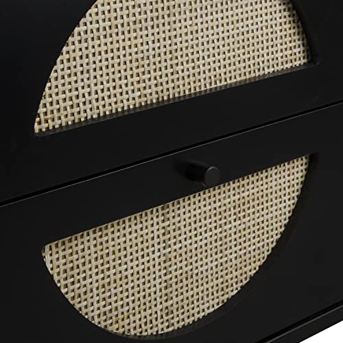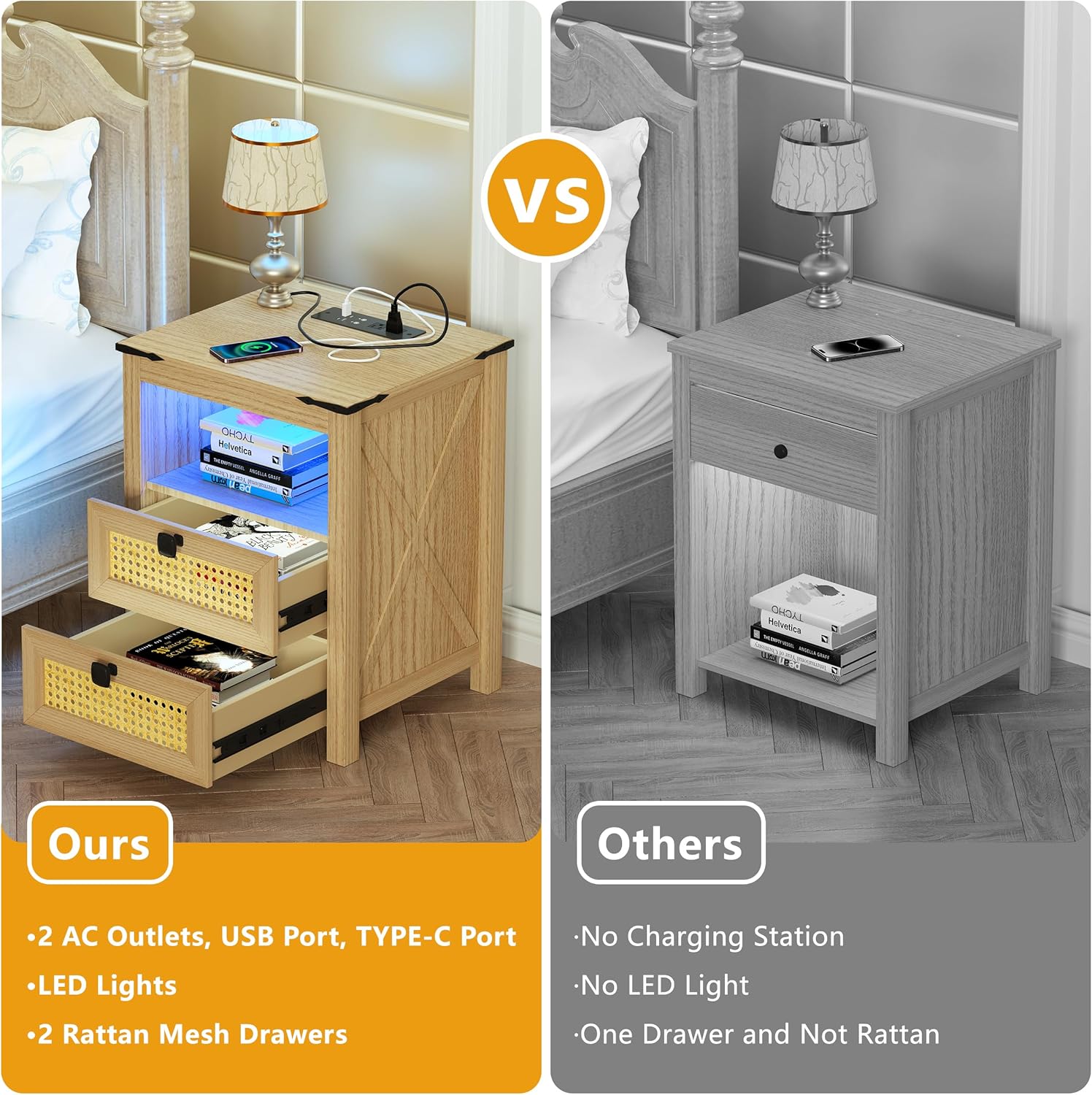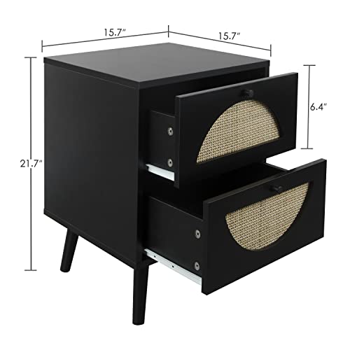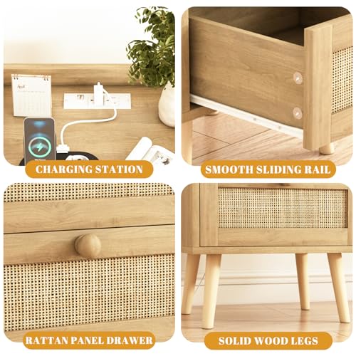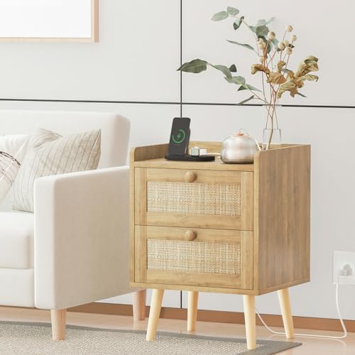 Rattan Nightstand with Charging Station Set of 2, Rattan Boho End Table with 2 Drawers Bedroom Bedside Side Tables Natural Night Stand for Living Room,Bedroom,Dorm Room Essentials