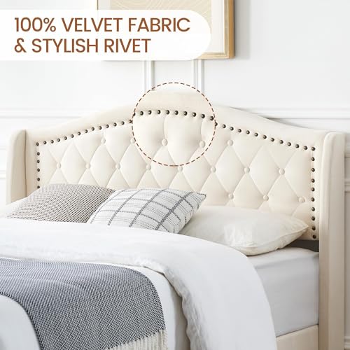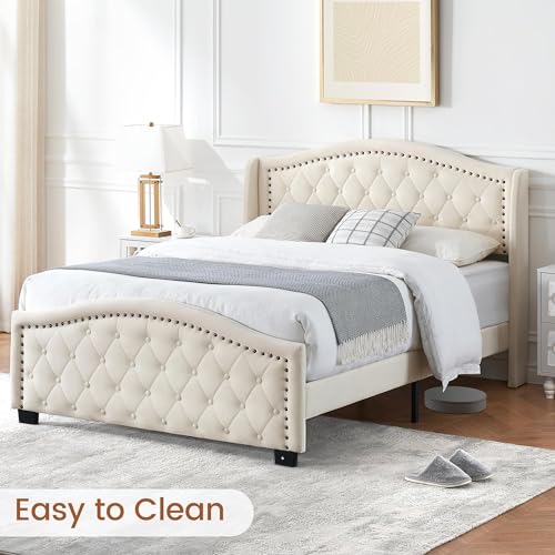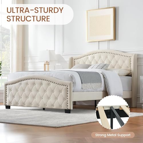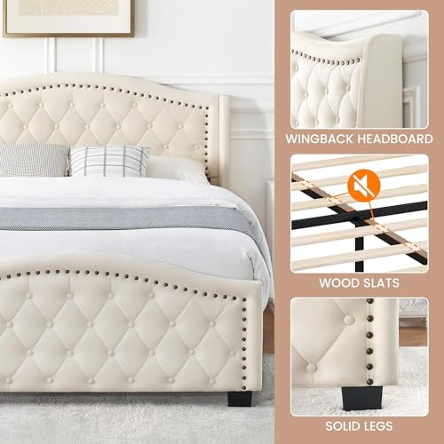 IDEALHOUSE Upholstered Bed Frame with Tall Wingback Headboard, King Platform Frame with Button Tufted Headboard,No Box Spring Needed, Strong Wooden Slats, Beige (King)