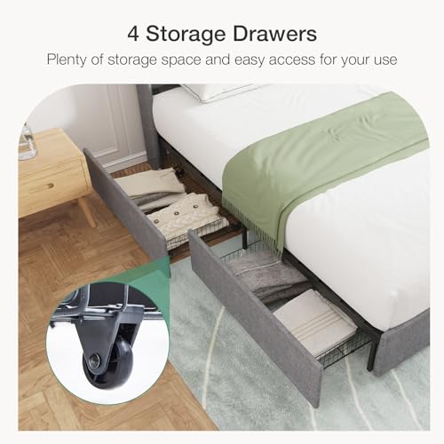 Novilla Upholstered Full Size Bed Frame Platform with 4 Storage Drawers and Fabric Headboard, Non-Slip and Noise-Free Full Bed Frame, Strong Wooden Slats, No Box Spring Needed, Beige