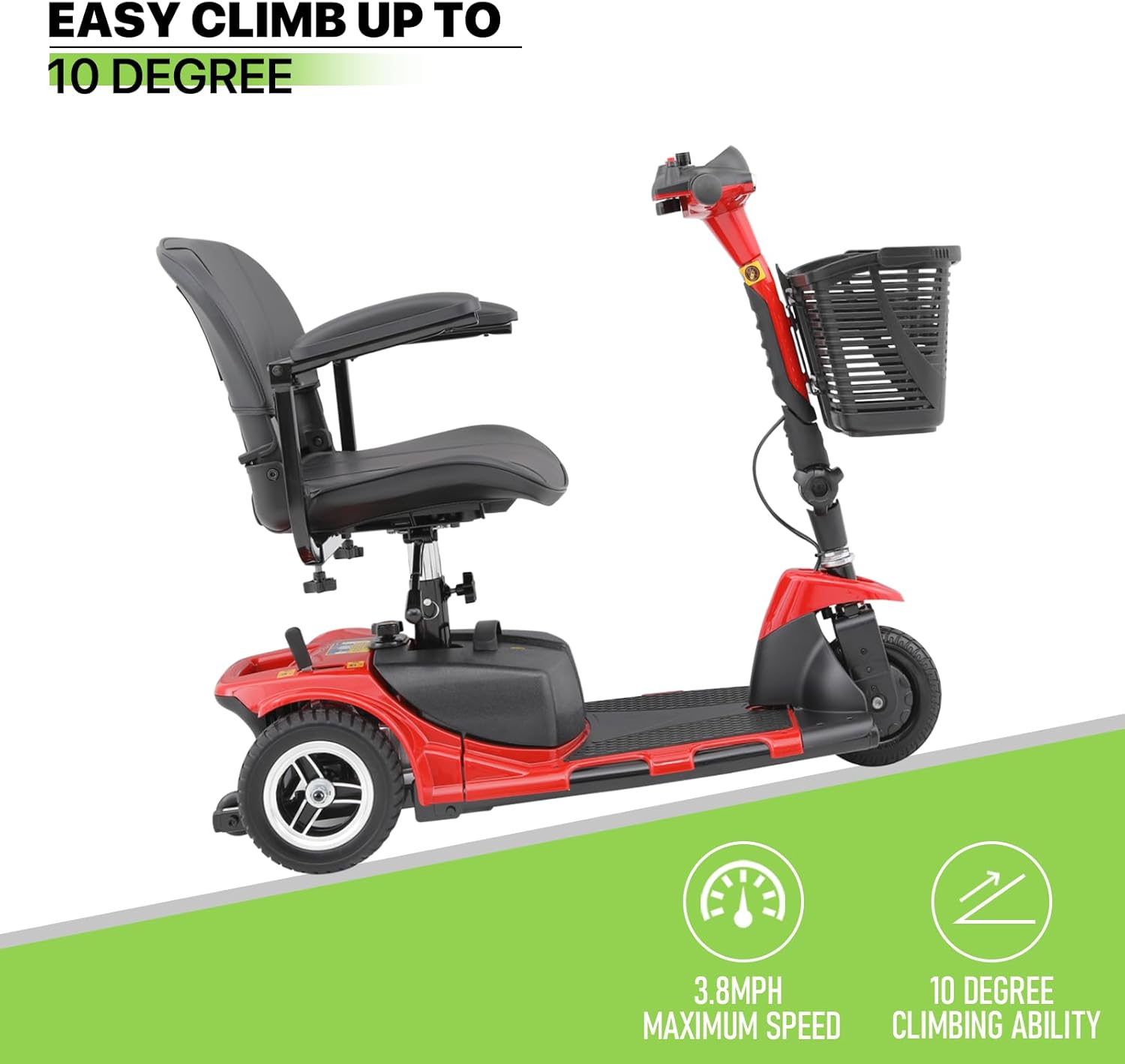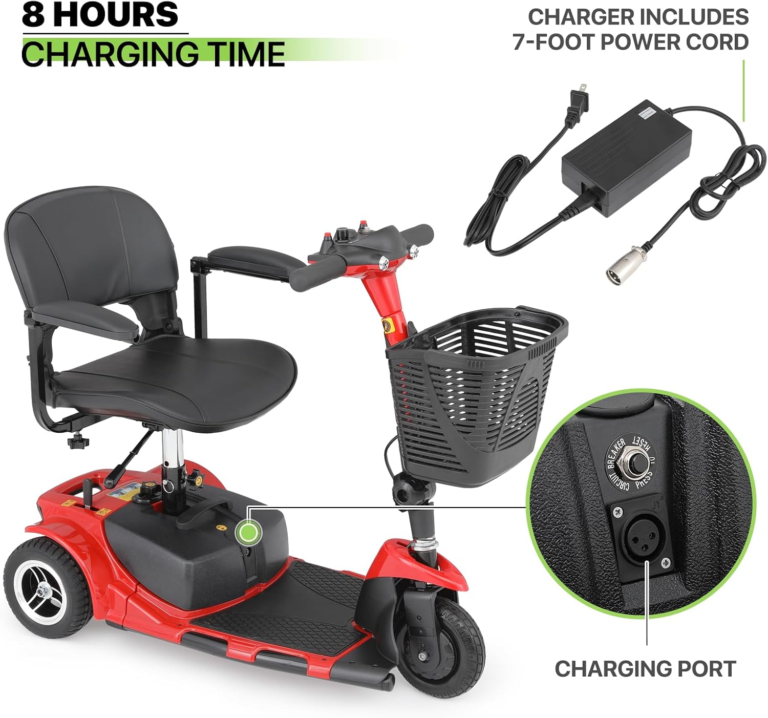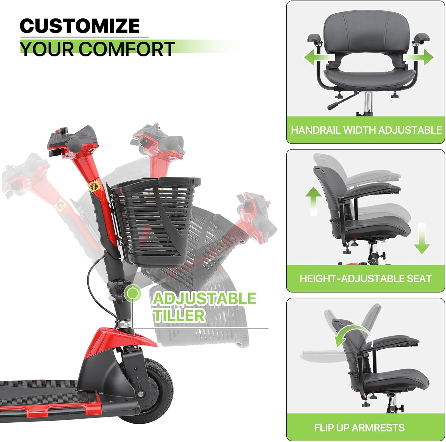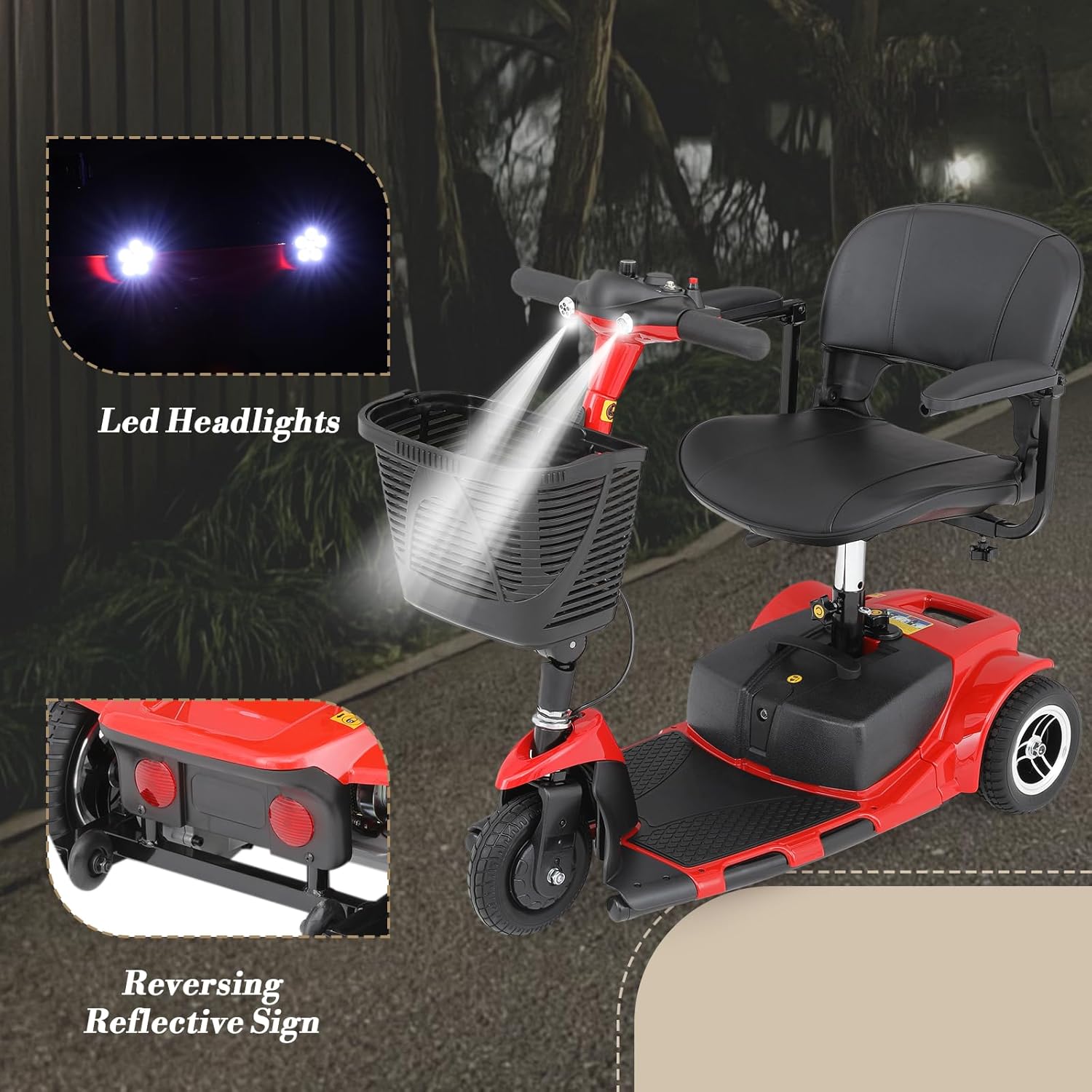 Athena Collection 3 Wheel Mobility Scooter Electric Wheelchair Scooter with Seat for Adults Seniors, Foldable Power Motorized Scooter Long Range Battery with Charger Headlights Basket, Red
