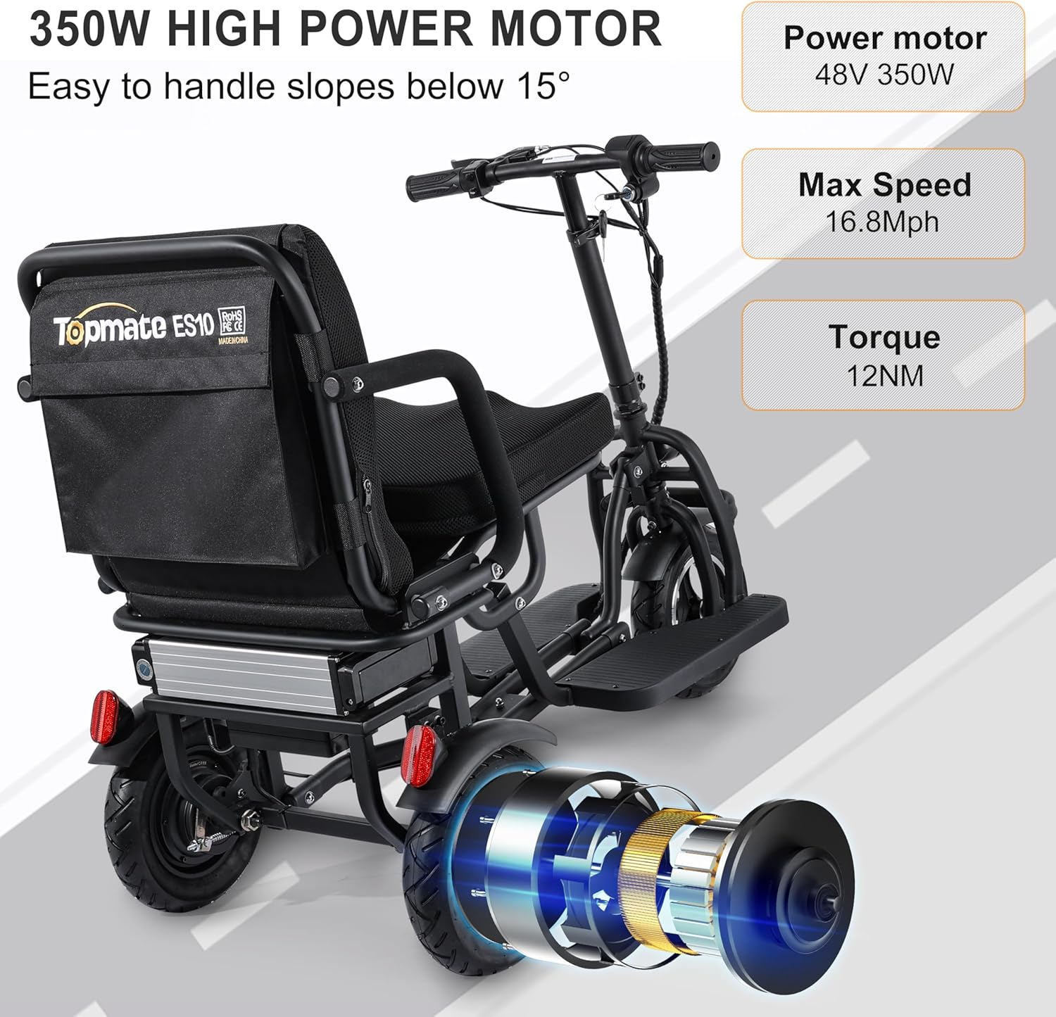 TopMate ES10 3 Wheel Electric Scooter Lightweight Folding Powered Mobility Scooter for Adult Seniors with Ergonomic Seat and Removable Battery, 350W Motor & 20Mi Long Range E-Trike with Basket - Black
