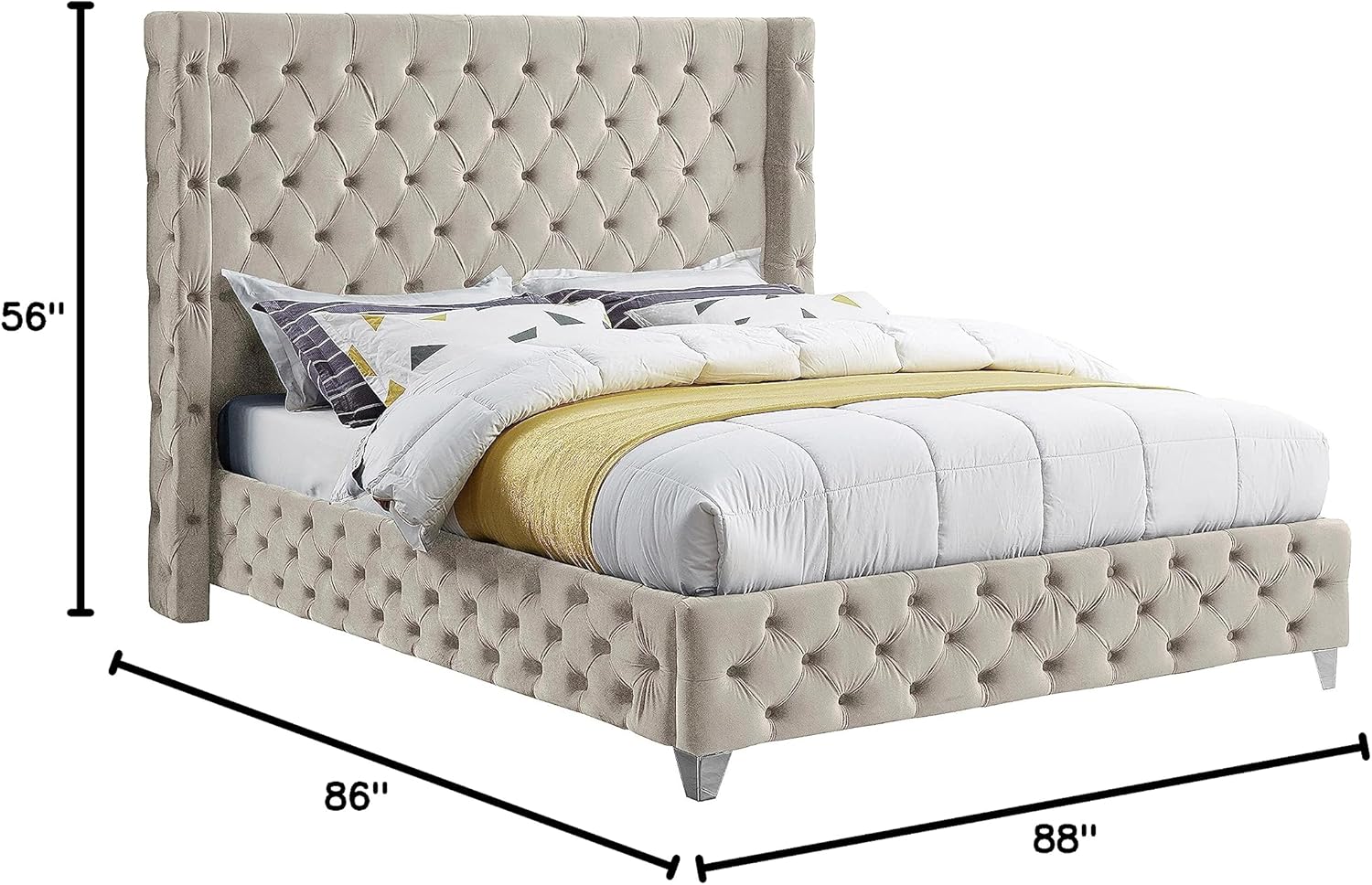 Meridian Furniture Savan Collection Velvet Upholstered Bed with Deep Button Tufting in Gold or Chrome Finish, King, Cream