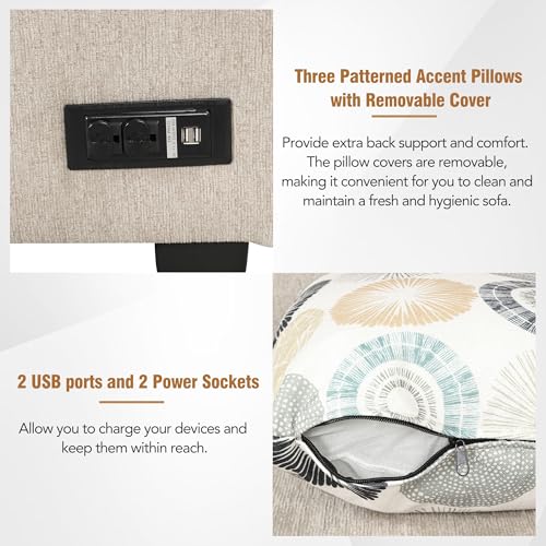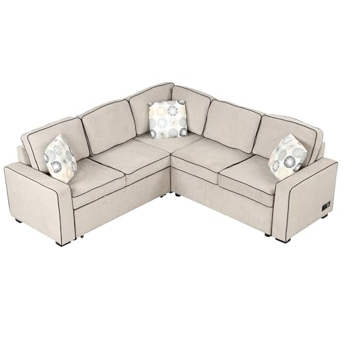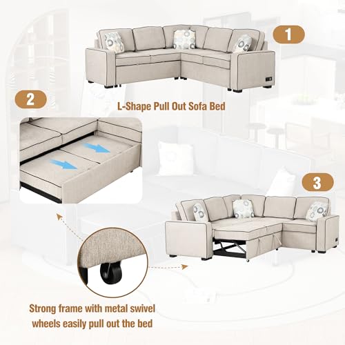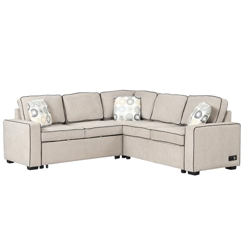 83" L-Shaped Pull Out Sofa Bed Modern Convertible Sleeper Sofa with 2 USB Ports, 2 Power Sockets and 3 Pillows for Living Room, Bedroom, Office, Cream Living Room Furniture