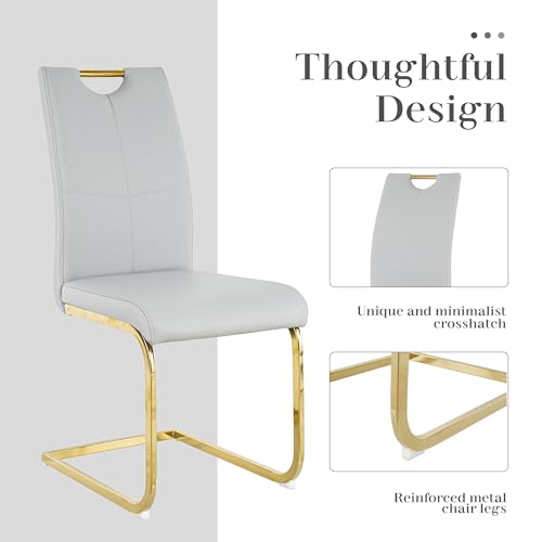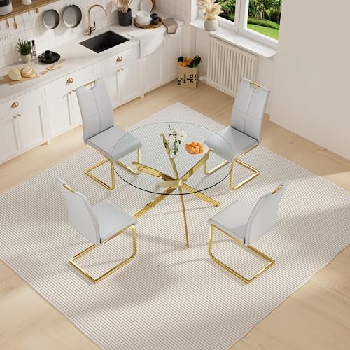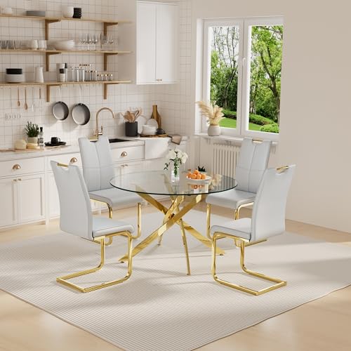 Modern Round Glass Dining Table Set for 6, Kitchen Table Set for 6,Tempered Glass Tabletop & Metal Electroplated Legs, 47" Round Dining Room Table Set with 6 White PU Leather Dining Chairs