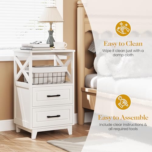 Tall Nightstand, Side Table with 2 Drawers and Open Shelf, Bedside Table with Solid Feet, Modern Night Stand End Table for Bedroom, Living Room, Home Office, White