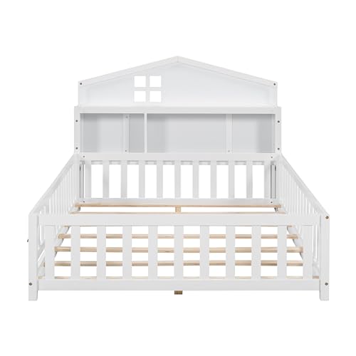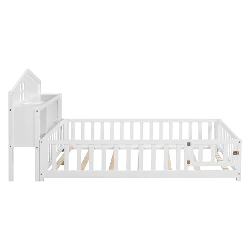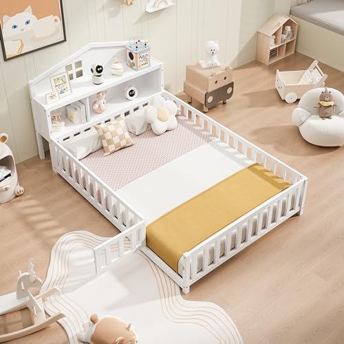 Bellemave Full Size Floor Bed for Kids, Girls, Boys, Solid Wood Montessori Bed with storage headboard, Full Size Montessori Floor Bed with door, kids floor bed with storage, Grey