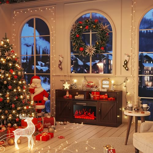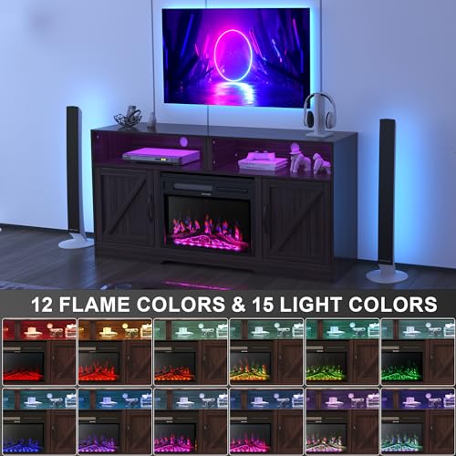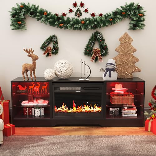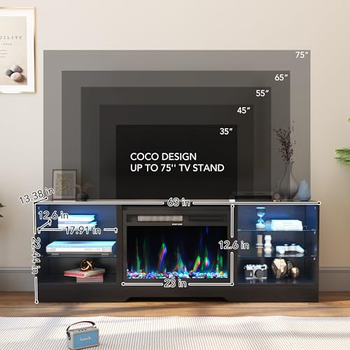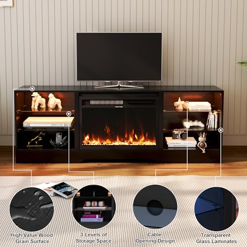 63" Fireplace TV Stand with 23" Fireplace, Electric Fireplace TV Console for TVs up to 75", LED Lights Wood and Glass Entertainment Center & Remote Control,Black