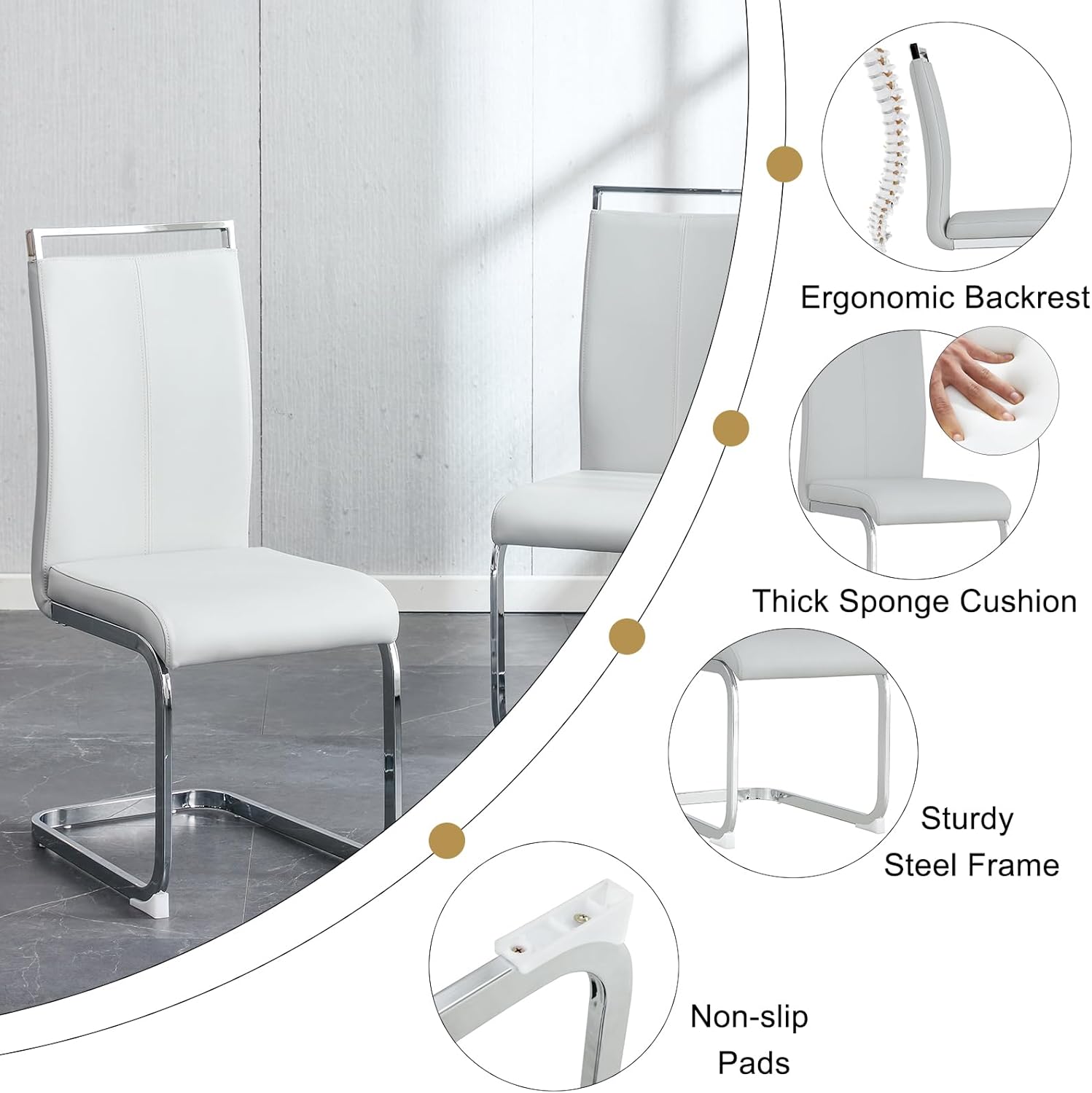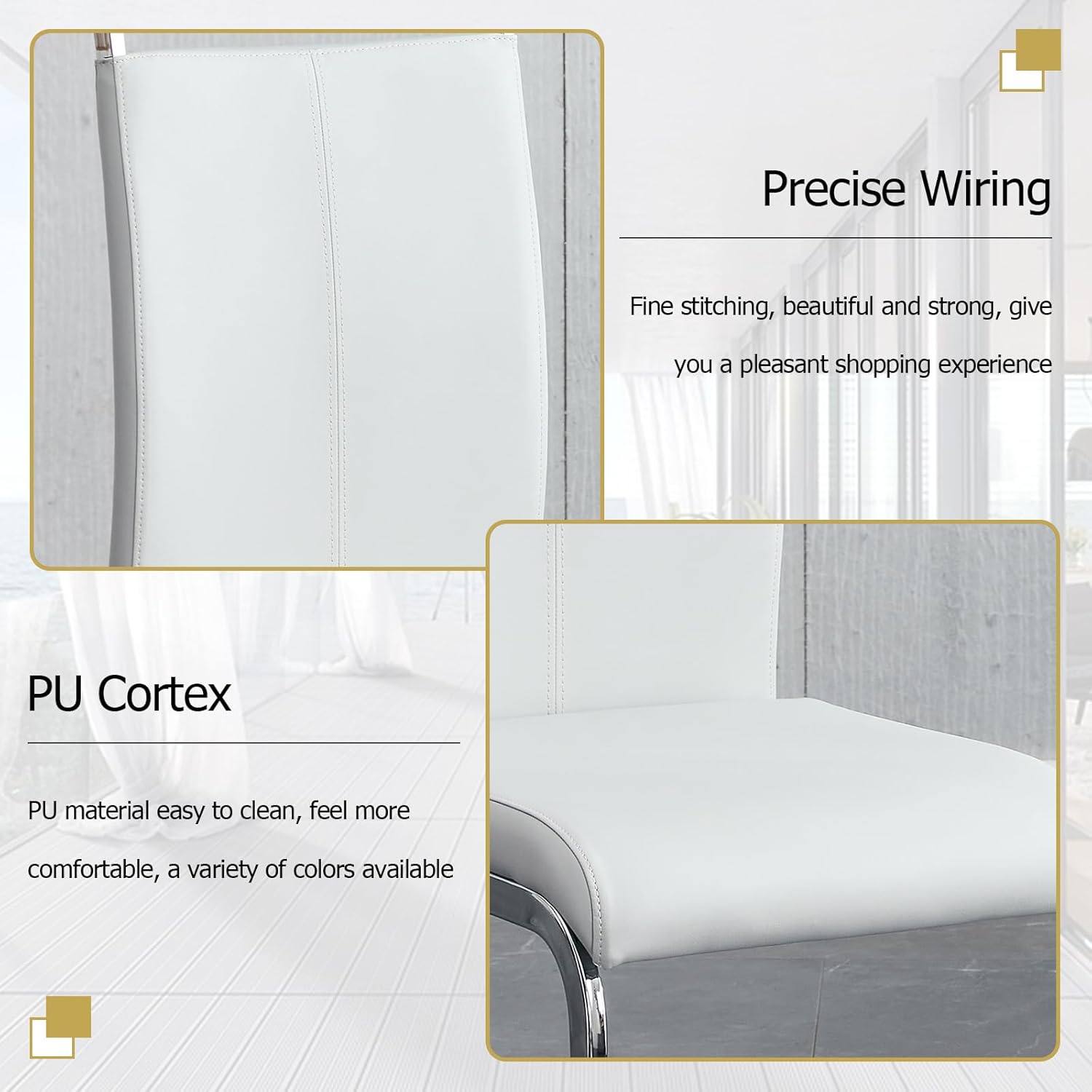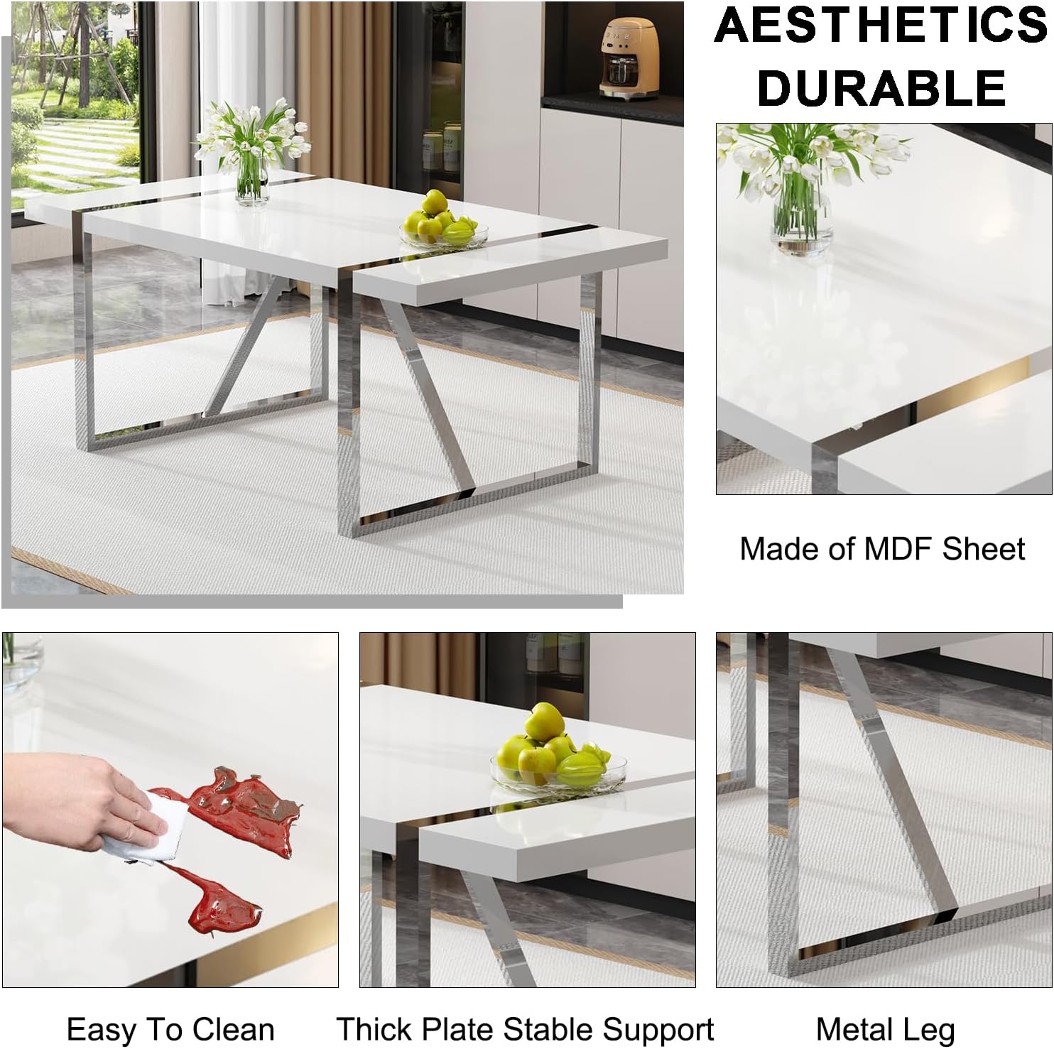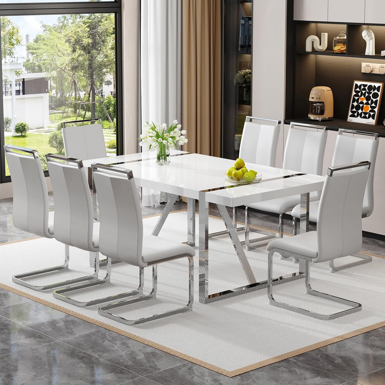 White Dining Table Set for 8,Rectangular MDF Kitchen Table and Leather Dining Chairs Set of 8, 9 Piece Dining Room Table Set,Modern Metal Frame Dinner Table Set 8 with Metal Frame For Kitchen