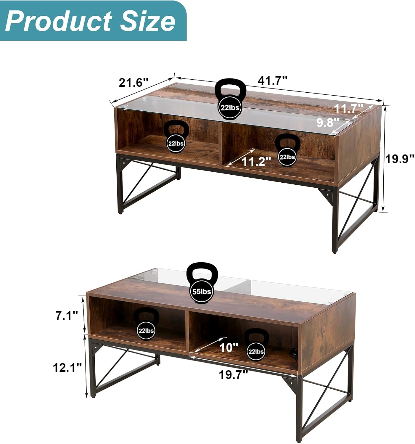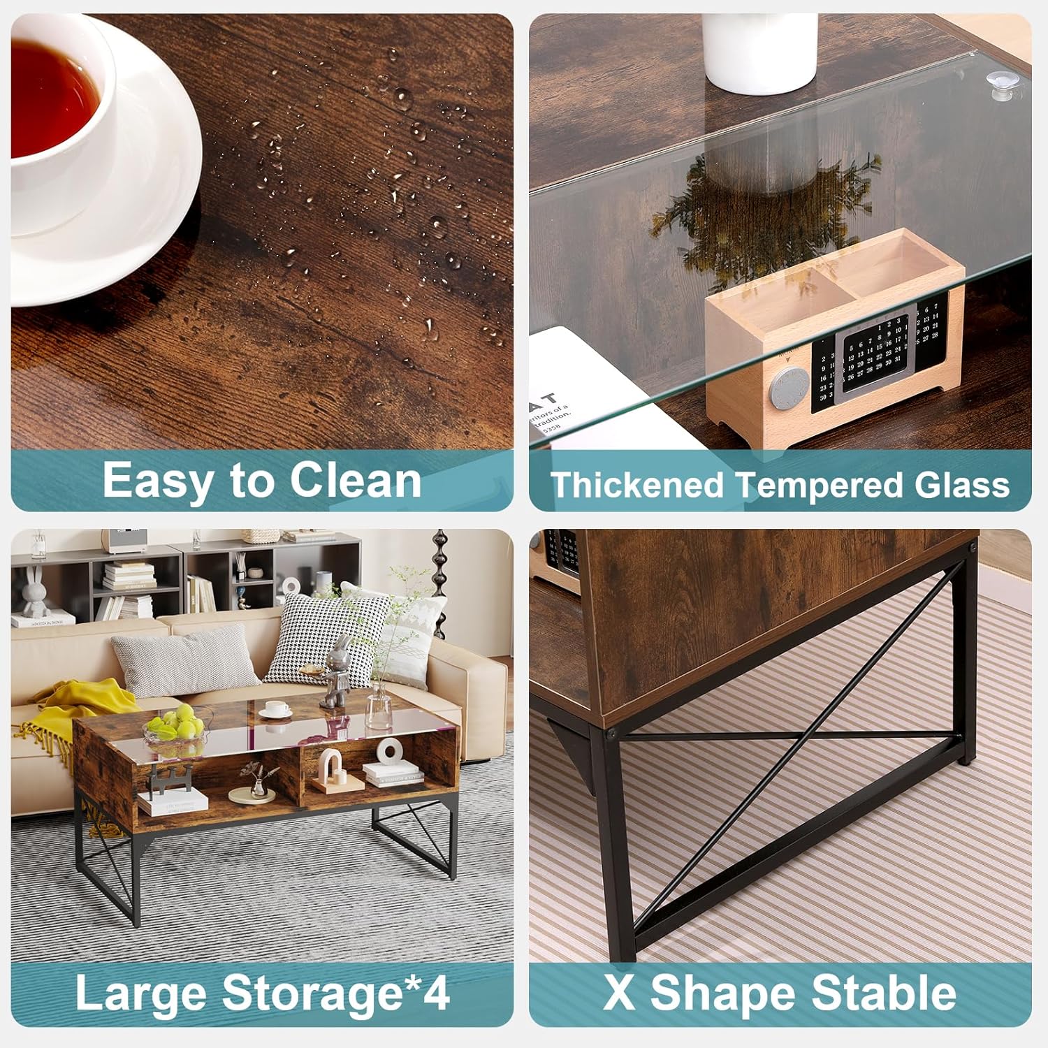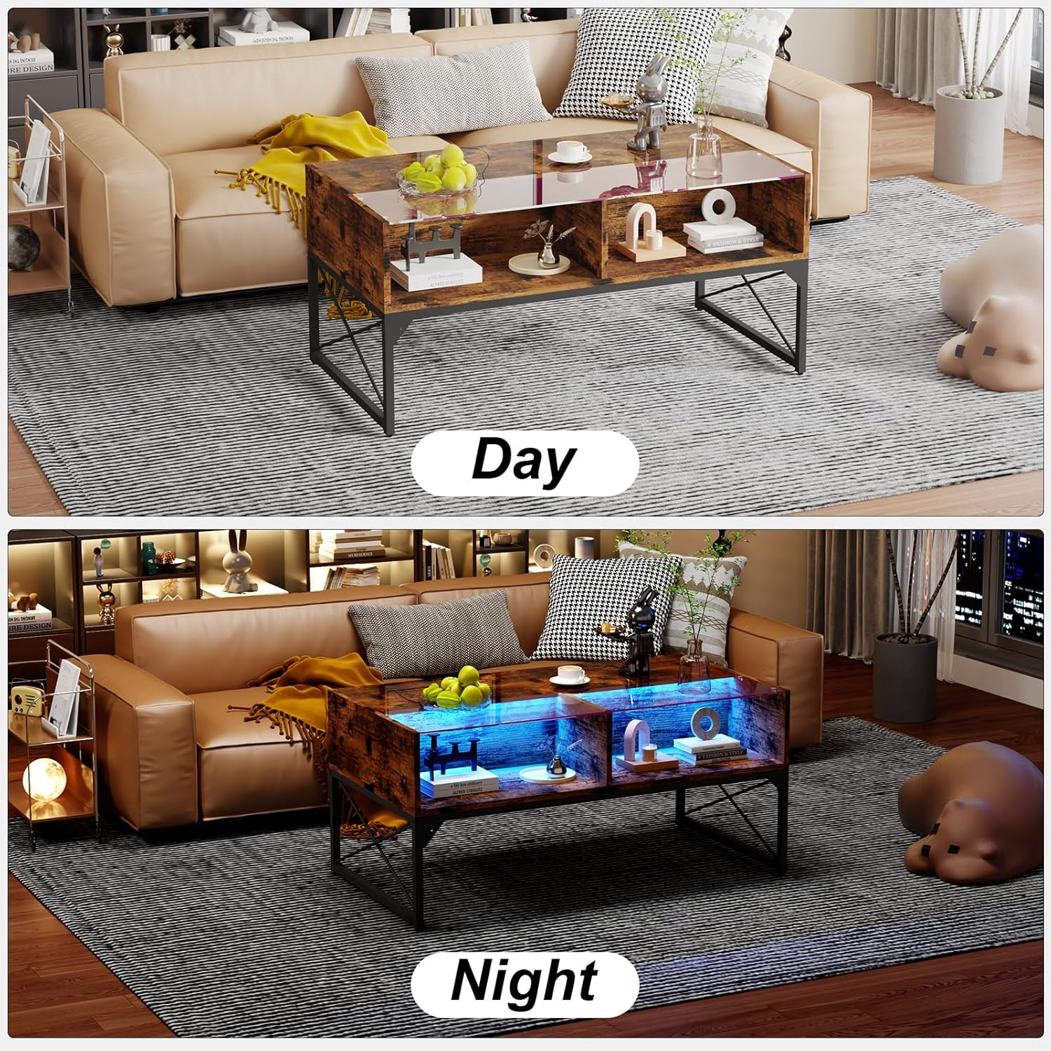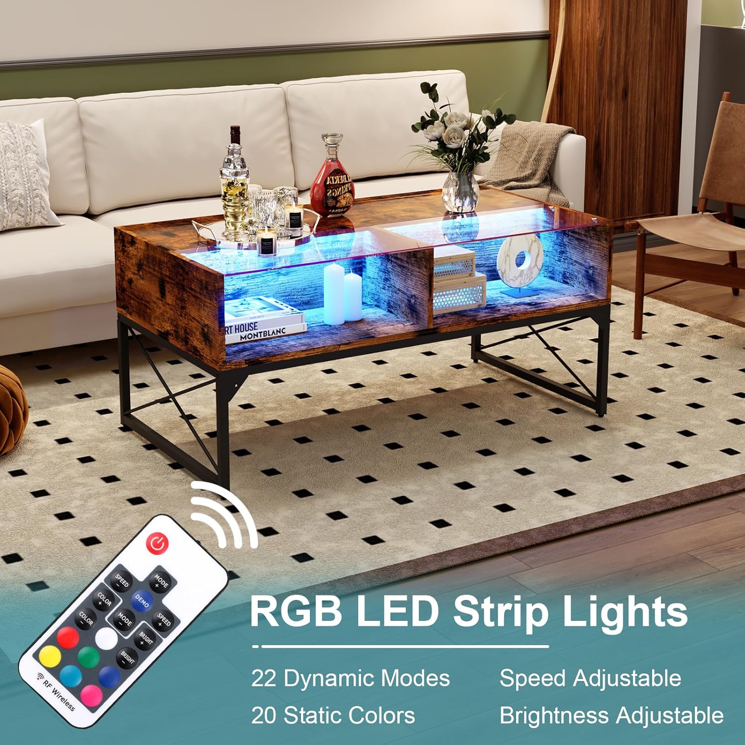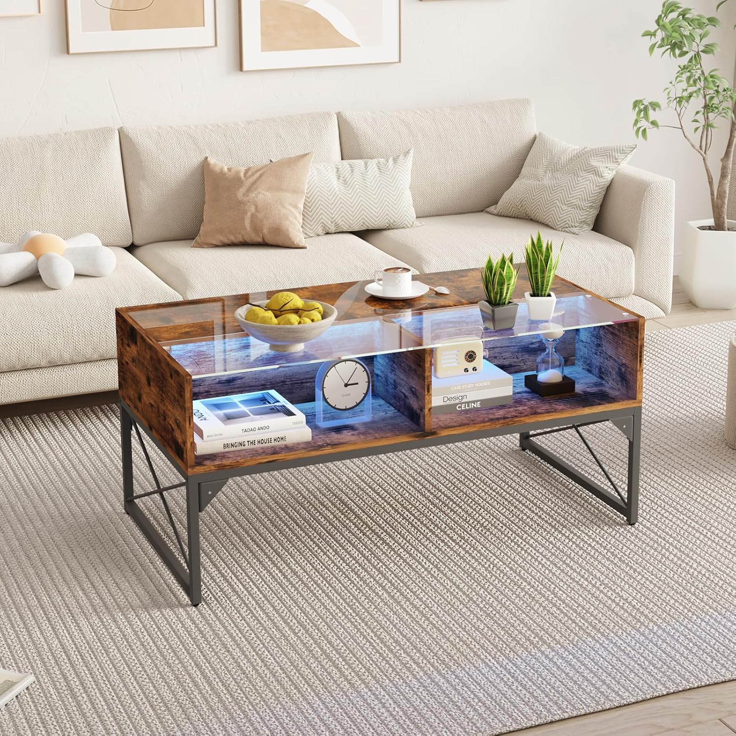 LED Coffee Table, 42Inch Modern Coffee Table with 4 Open Storage Compartments, Half Glass Half Wood, Glass Center Table for living Room, Game Room, Reception Room Office,Rustic Brown