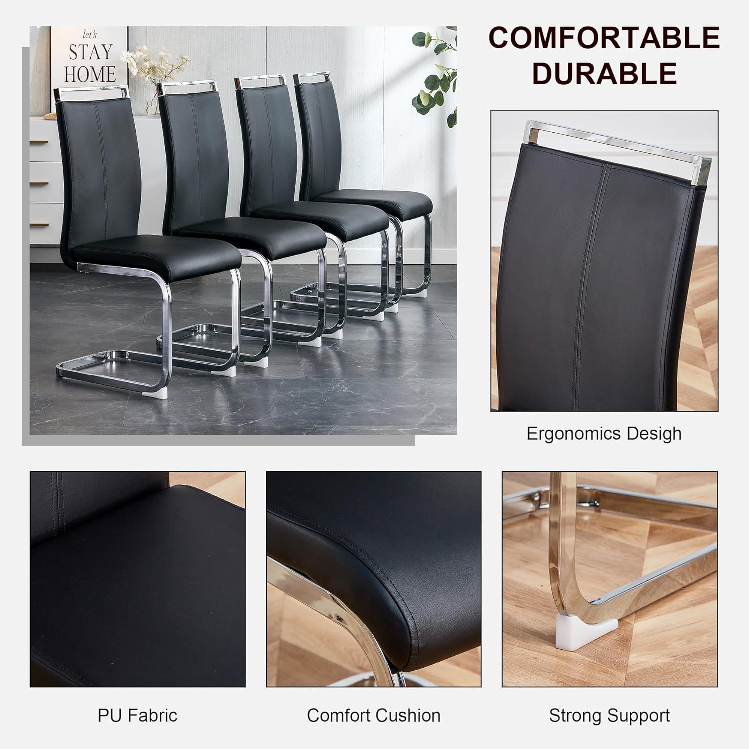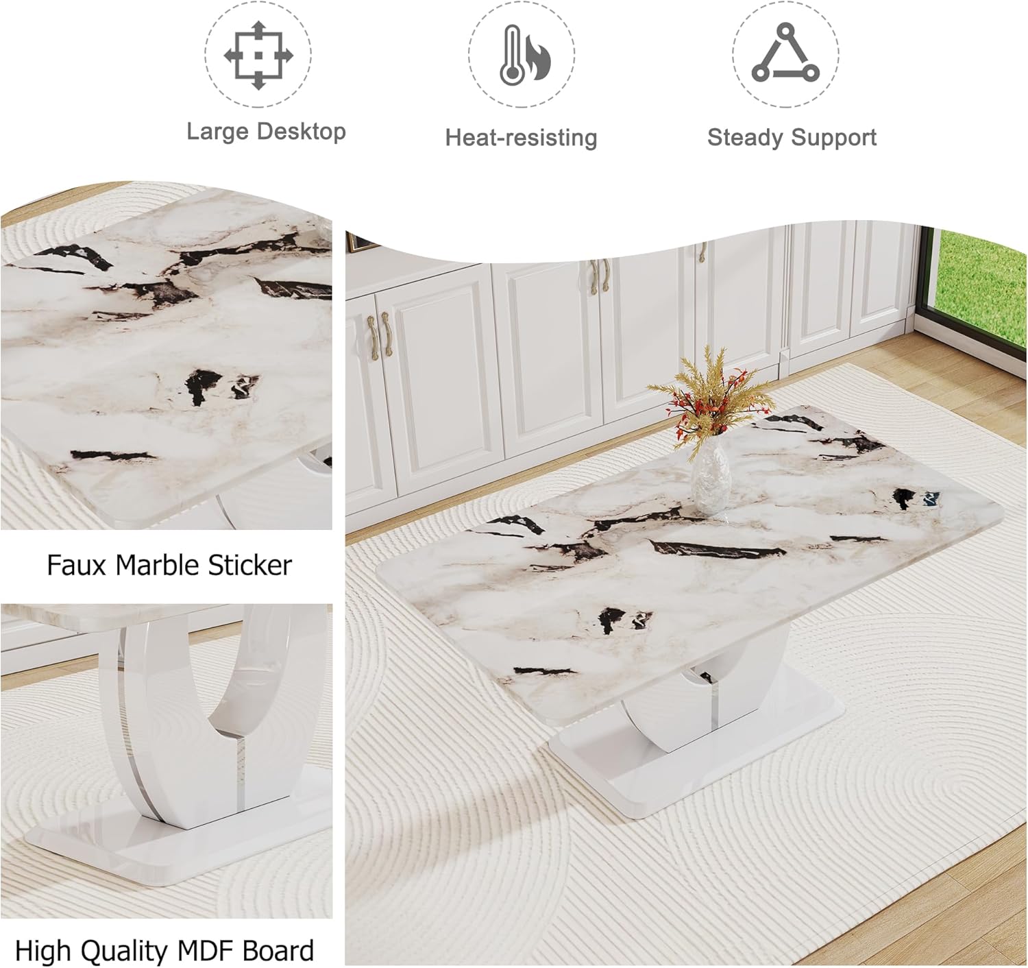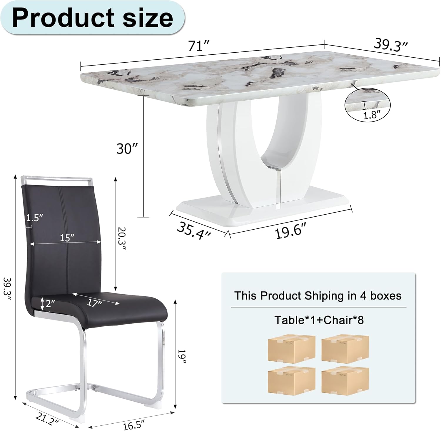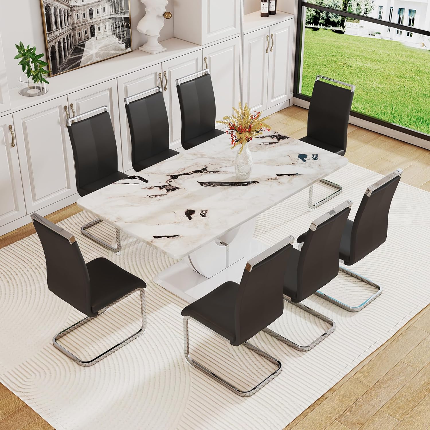 Faux Marble Dining Table Set for 8, 9 Pieces Dining Table Set, 71 inch White Marble MDF Tabletop with MDF U-Shaped Base, Black PU Faux Leather Chairs with Silver Metal Legs, for Dining Room