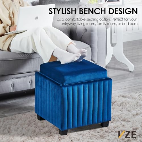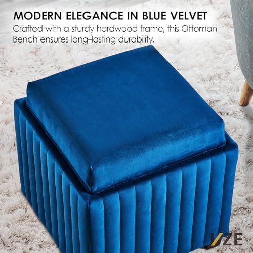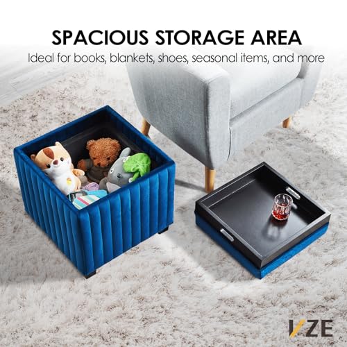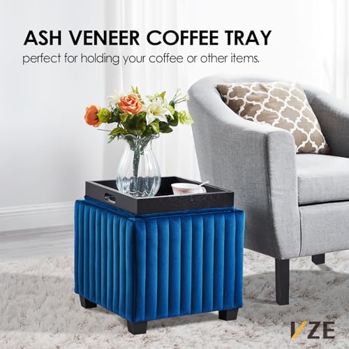 18-Inch Contemporary Square Cube Storage Ottoman Bench with Coffee Tray, Coffee Table for Living Room, Ottoman Footrest for Bedroom End of Bed, Beige Velvet Fabric in Modern Sawing