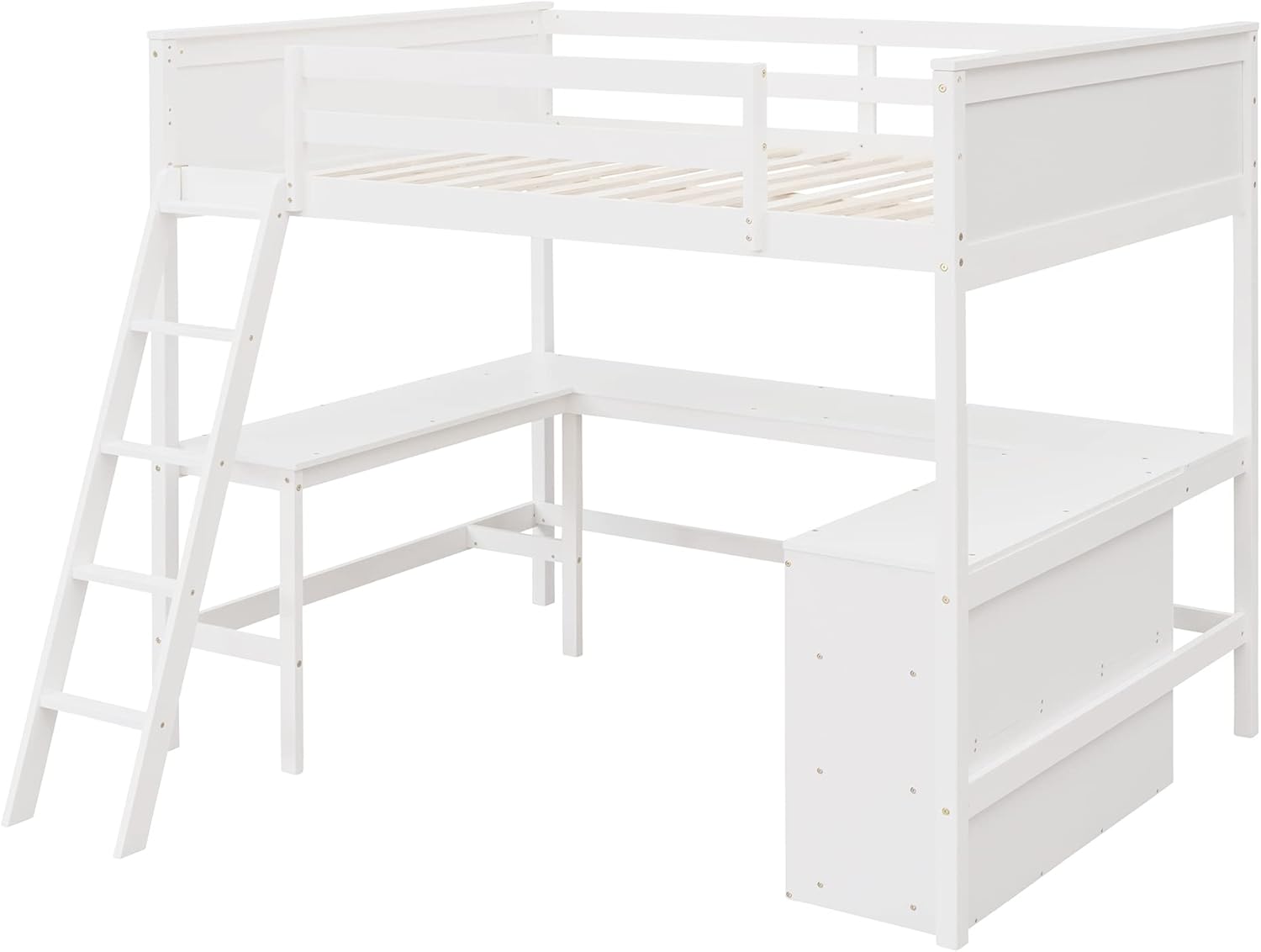 Full Size Loft Bed with Desk and Storage Cabinet, Solid Wood High Loftbed Frame with Headboard and Guard Rails, for Teens Adults Bedroom, White