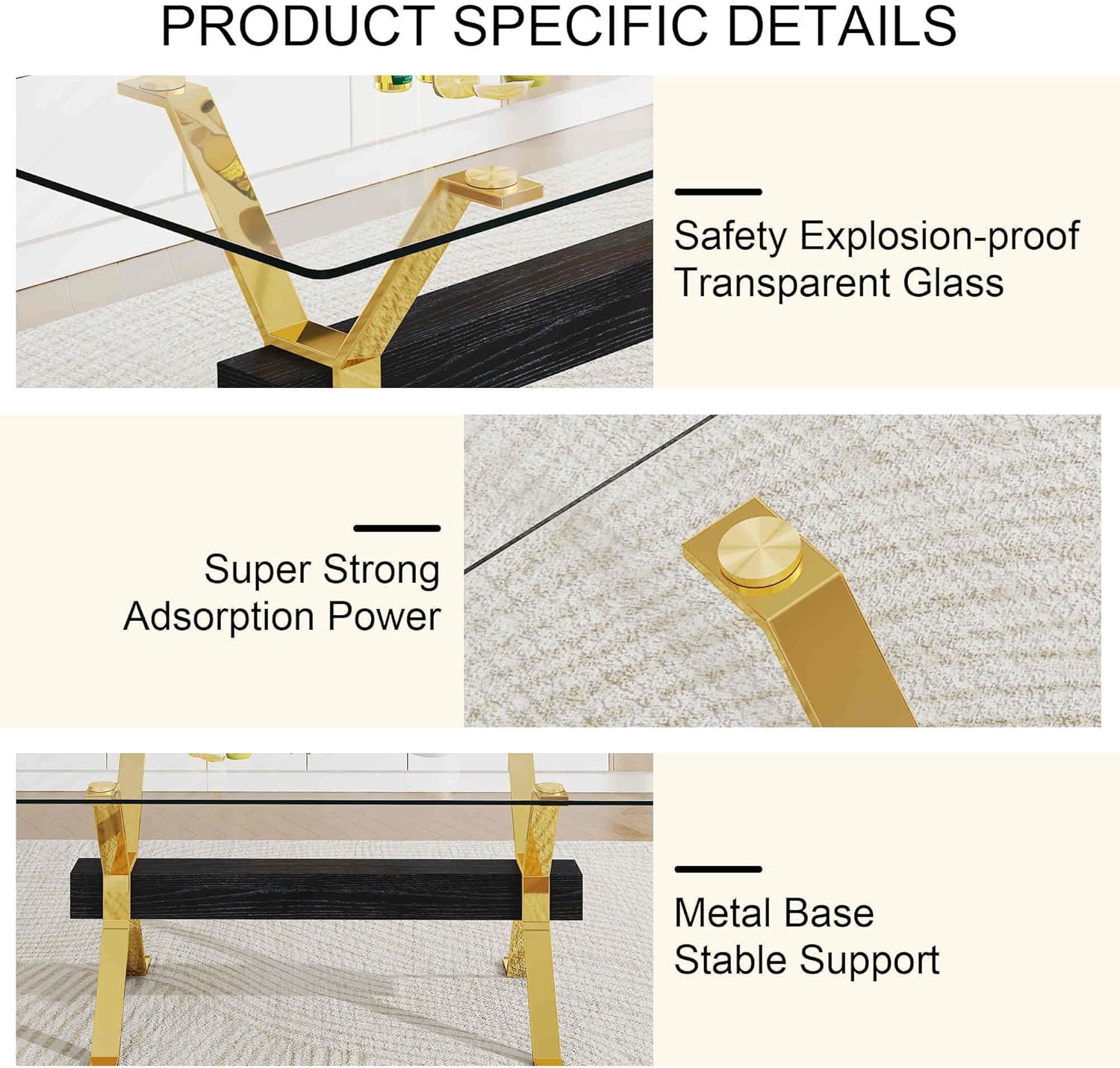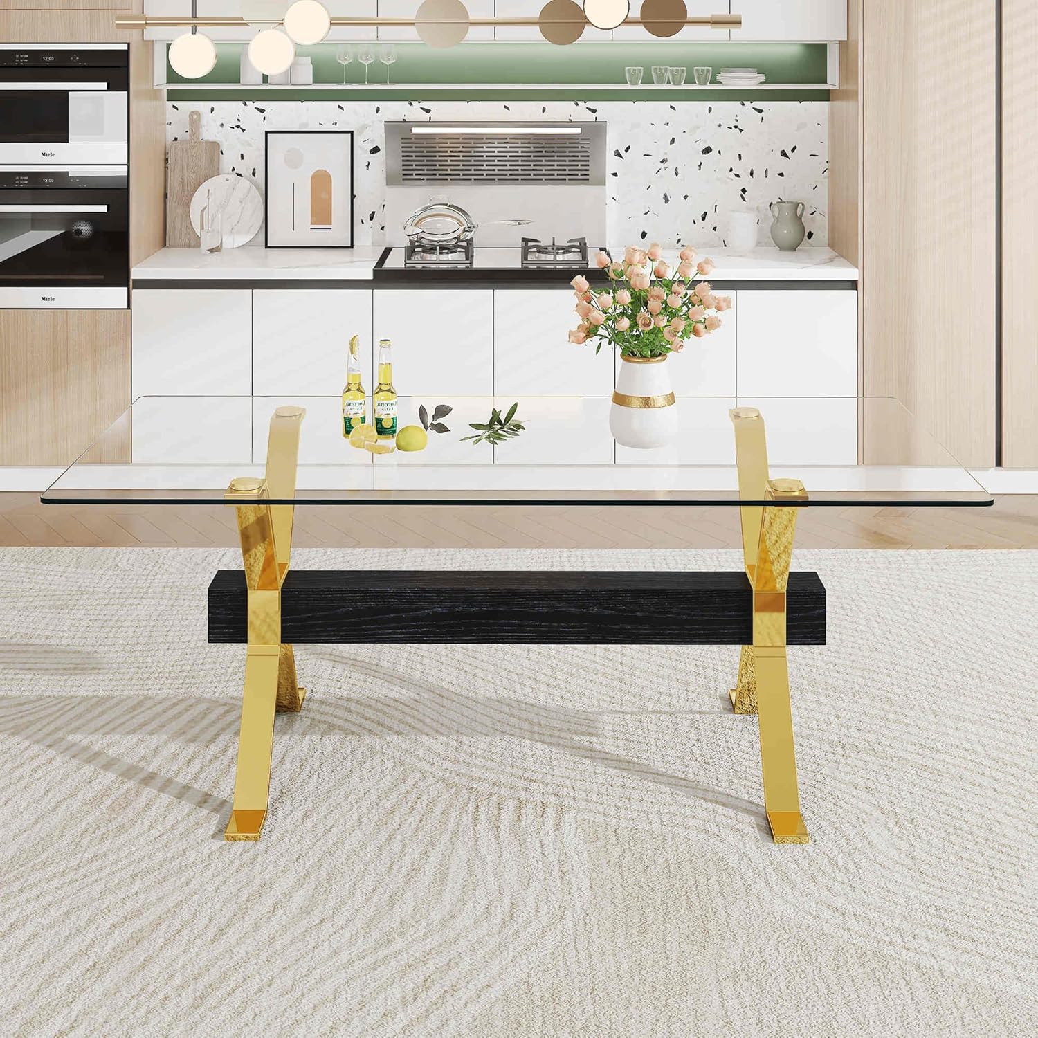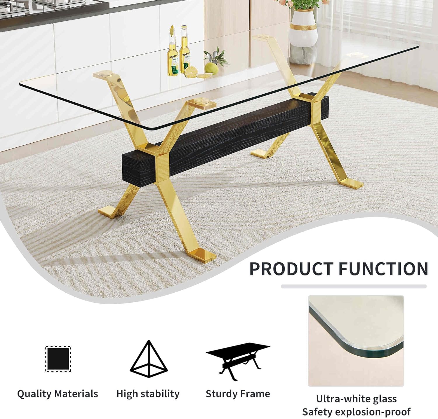 9-Piece Dining Table Set with 8 Soft Cushioned Chairs – Elegant Tempered Glass Table for Kitchen & Dining Room Furniture with Gold-Plated Legs – Stylish and Durable Dining Set