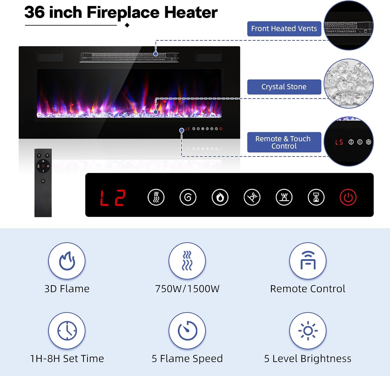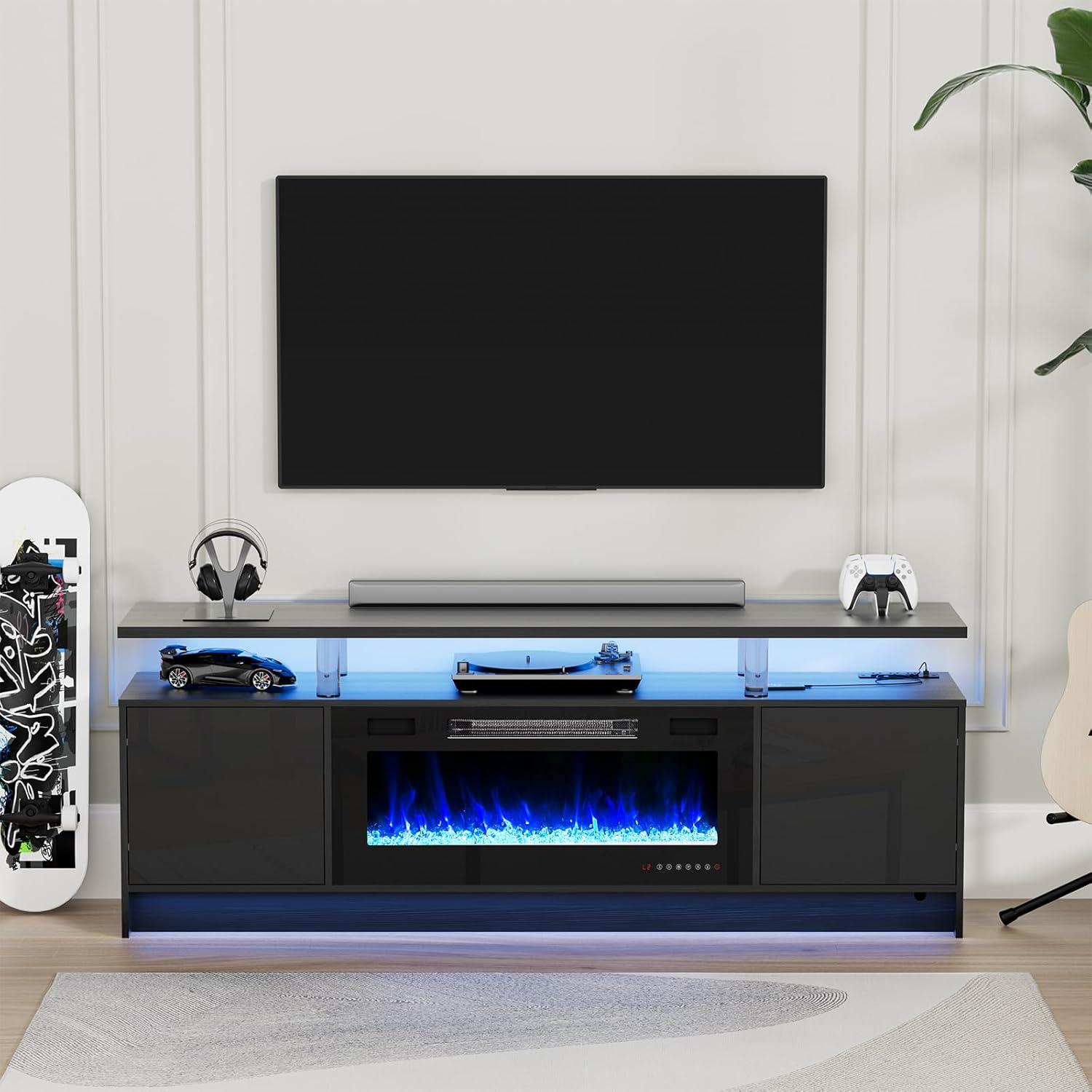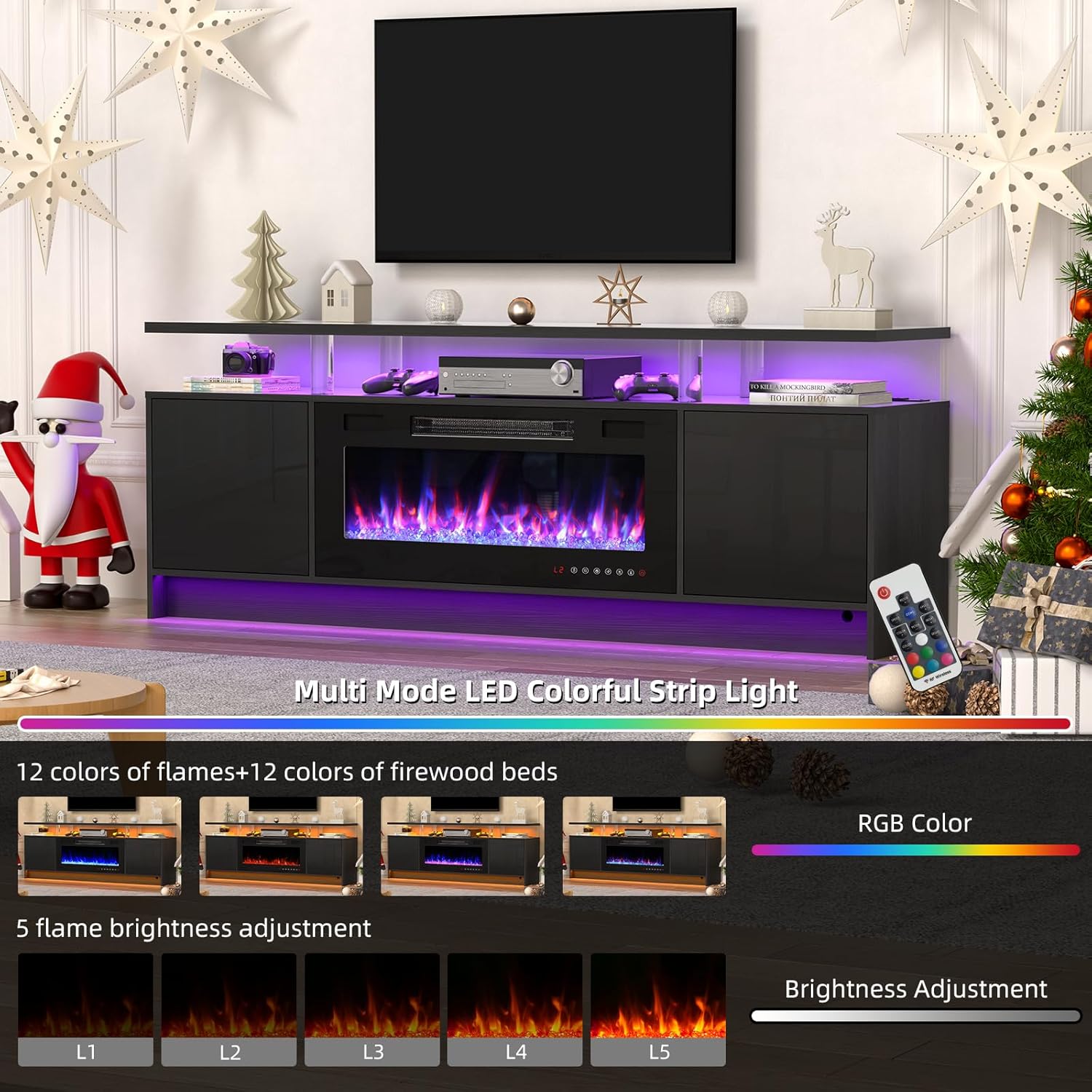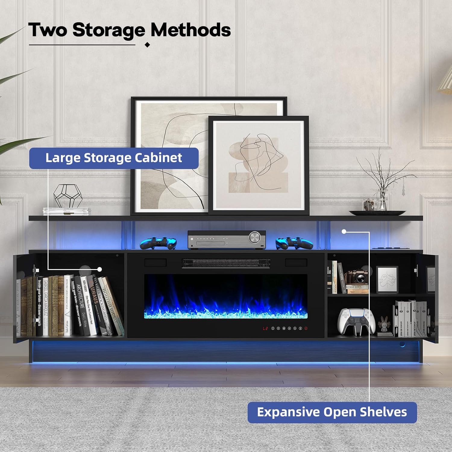 Fireplace TV Stand with 36" Fireplace, 70" Entertainment Center, LED Lights, 2 Tier, 80" TV Capacity