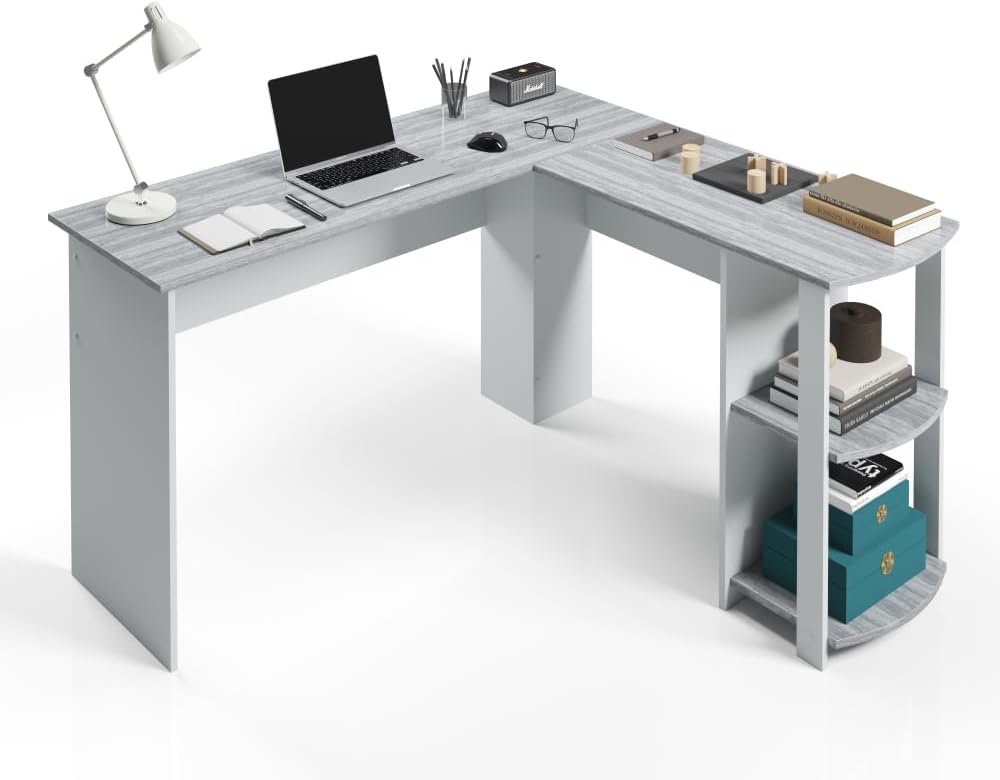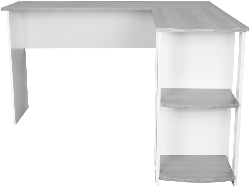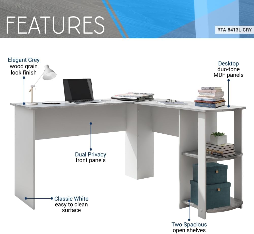 Modern L-Shaped Desk with Side Shelves, Grey Gray Solid Wood -8413L-GRY