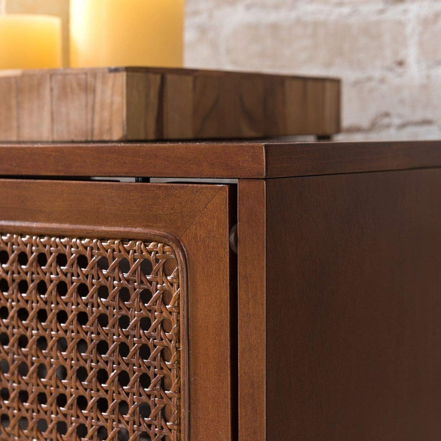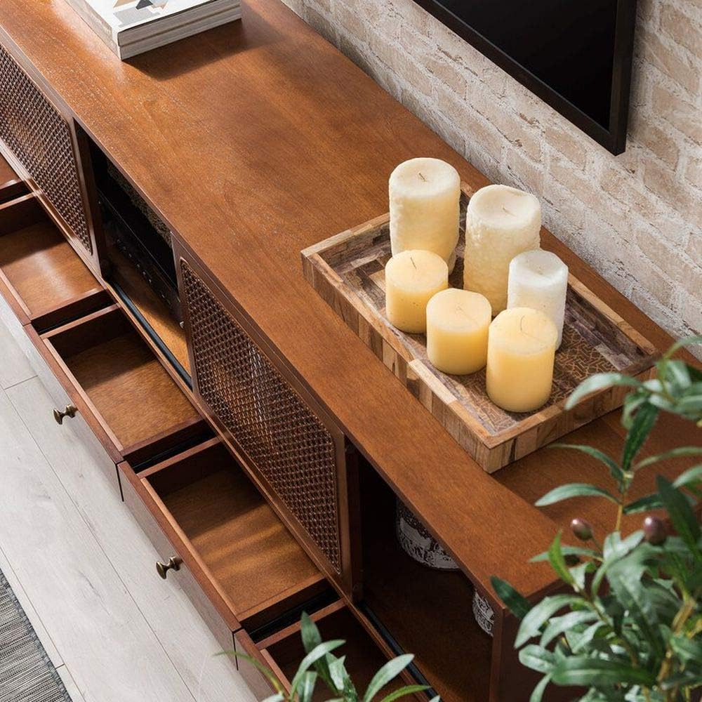 Mid Century Modern TV Stand Provides Retro Style & Contemporary Function. 70" Entertainment Center Features Open Center Shelf, 2 Cabinets and 5 Drawers. Solid Wood Media Cabinet Creates Timeless Feel.
