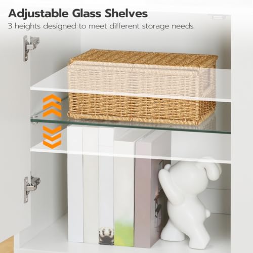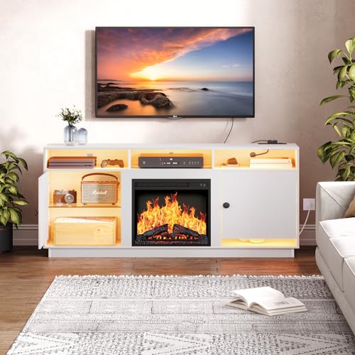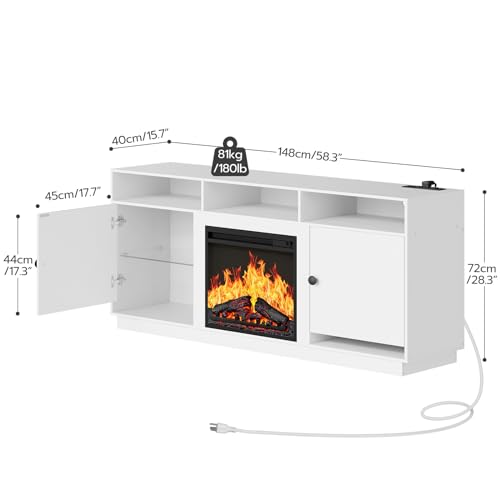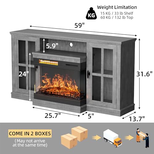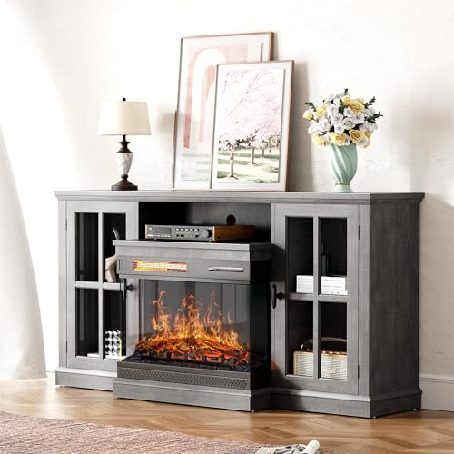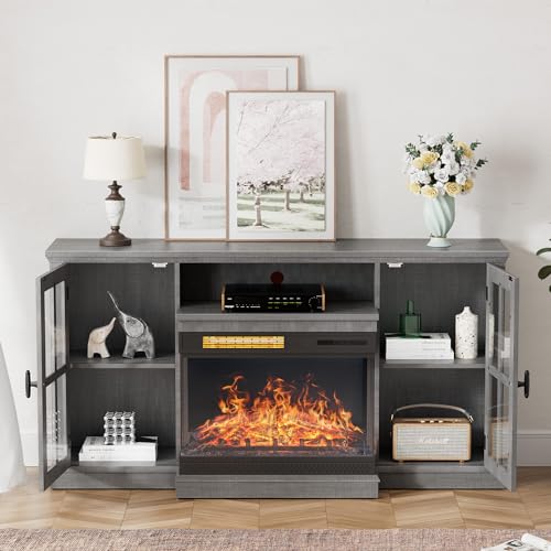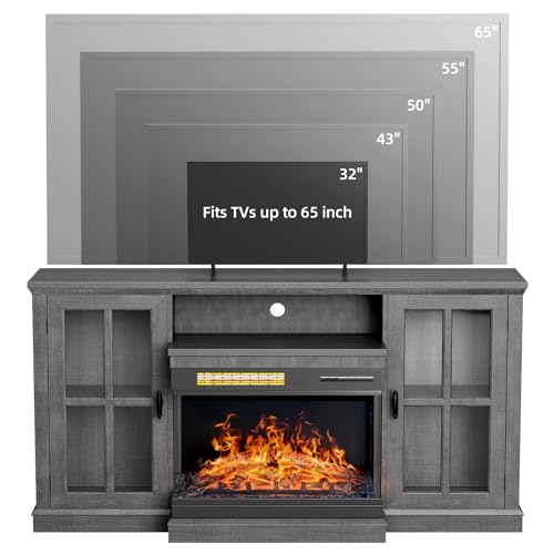 YESHOMY Glass Fireplace TV Stand for Televisions up to 65", Media Entertainment Center Console Table with Doors Closed Storage, Gray