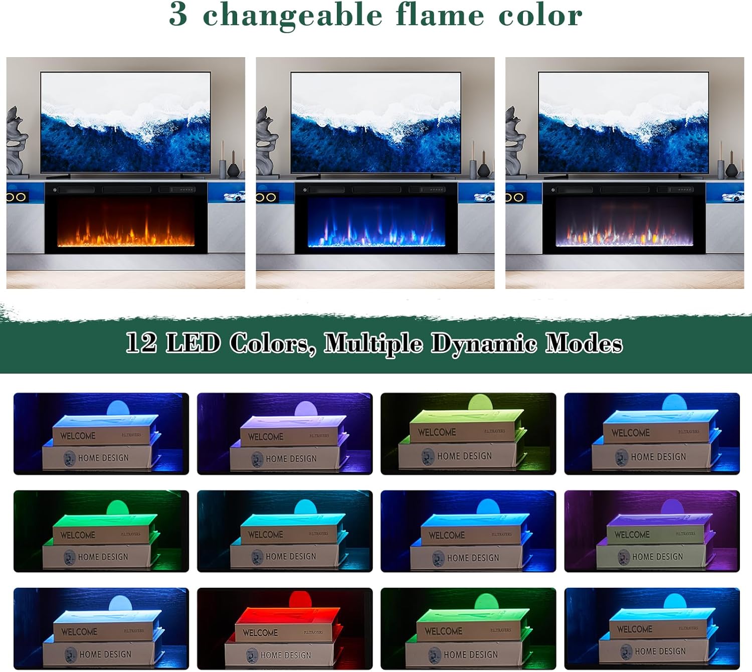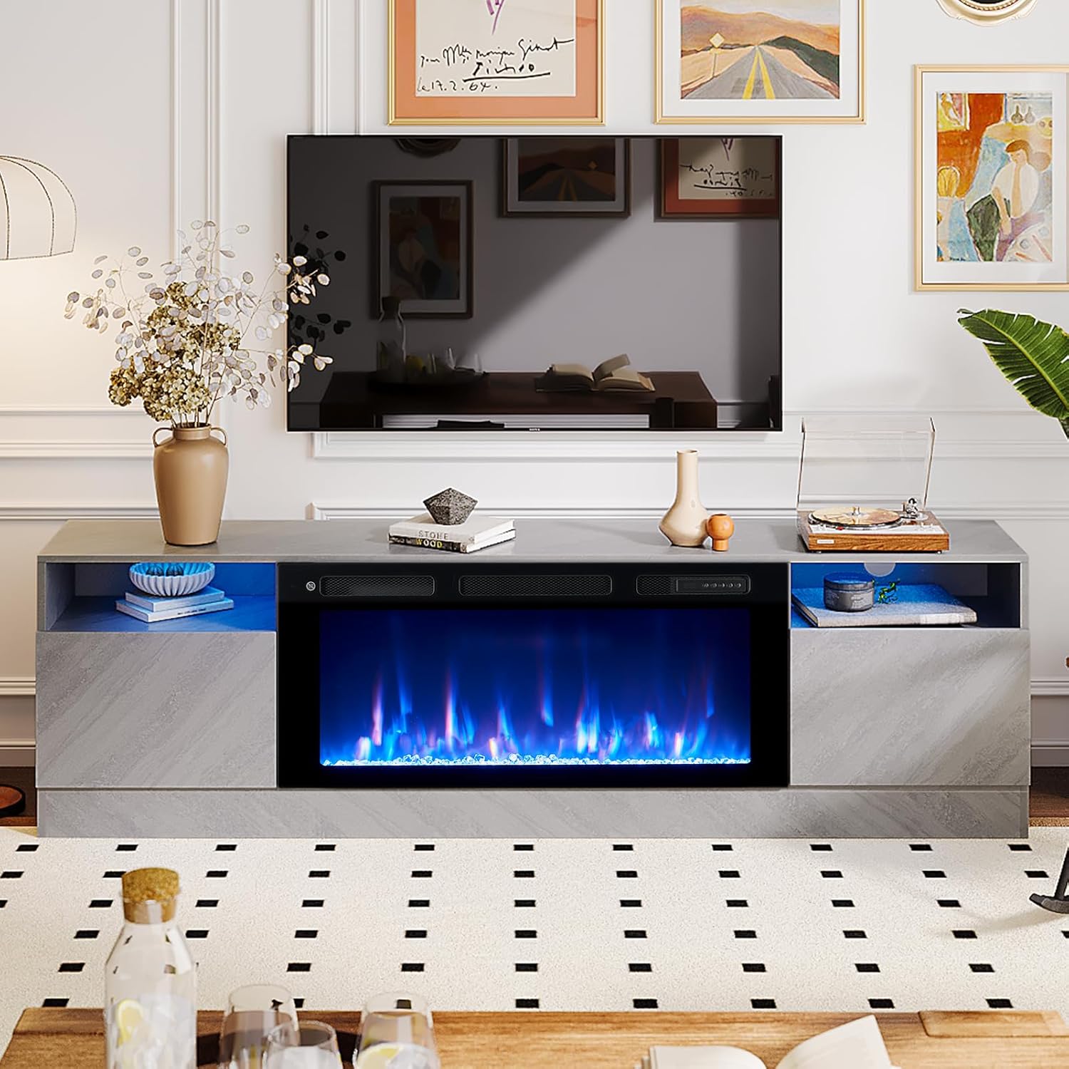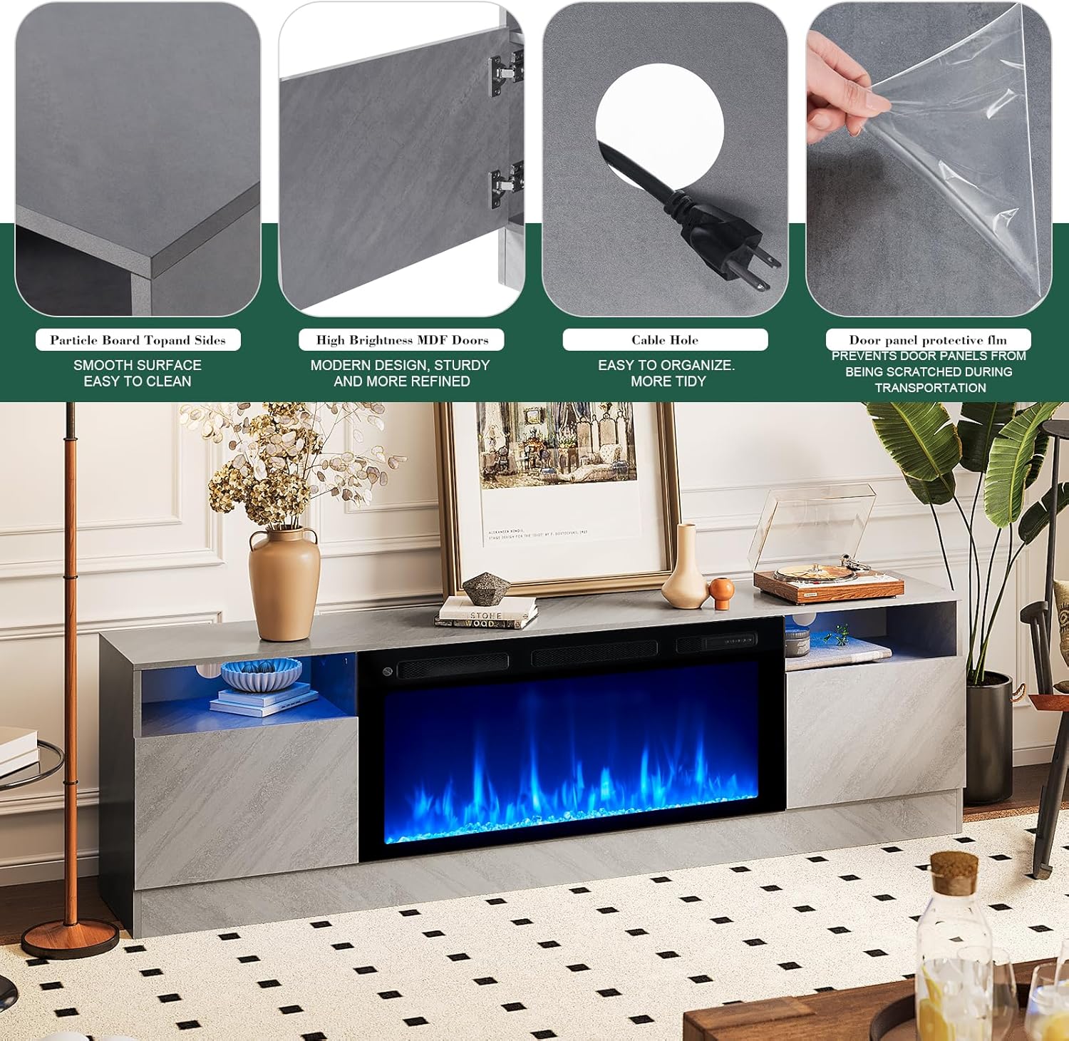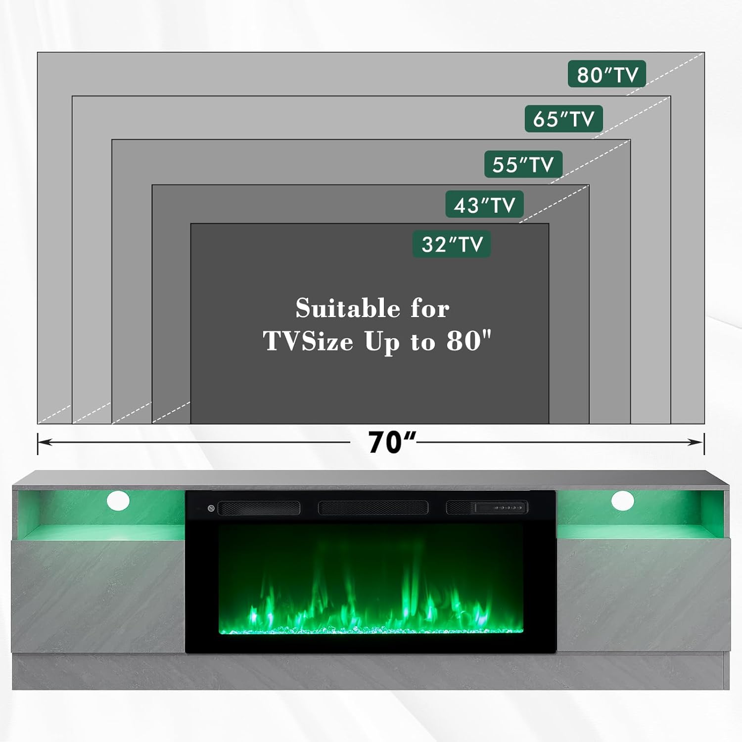 Fireplace TV Stand with 36" Electric Fireplace, LED Light Entertainment Center, Modern Wood Texture Entertainment Stand with Highlight Storage Cabinet for TVs Up to 80", 70 inches, Gray