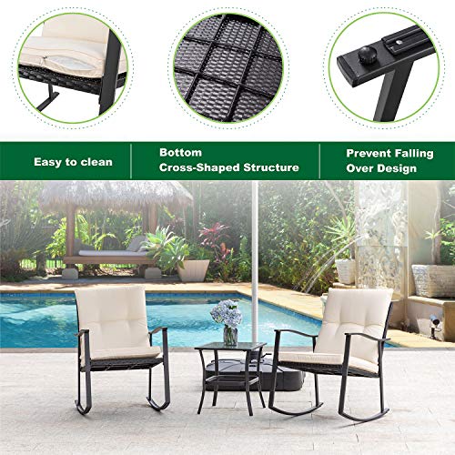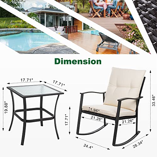 Shintenchi 3 Piece Rocking Bistro Set, Outdoor Furniture with Rocker Chairs and Glass coffee table set of 3, Balcony, Porch Furniture for Small Space, Light Gray