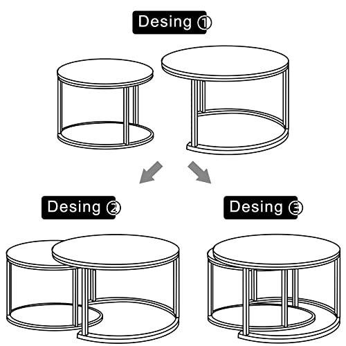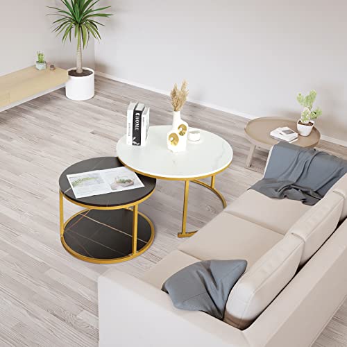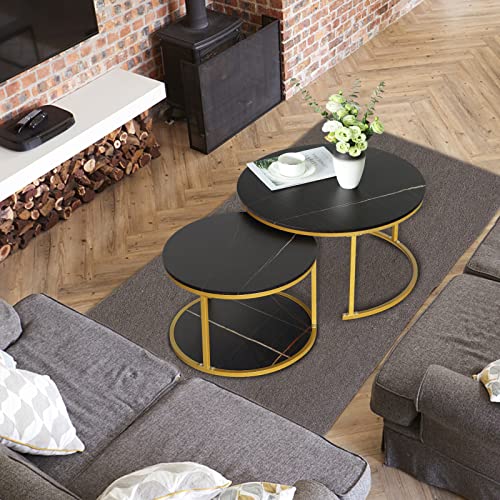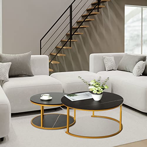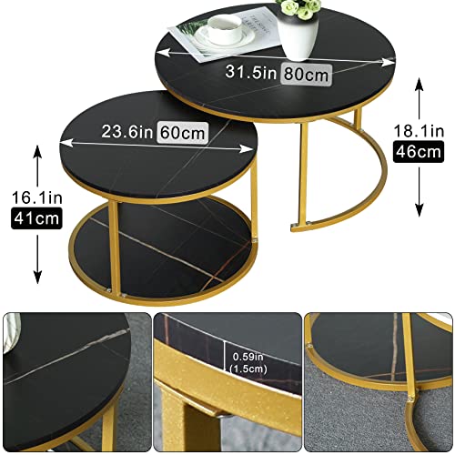 Nesting coffee table 2 sets, marble look wood side table, sturdy gold frame modern round coffee table for living room balcony office round table, easy to assemble(Black+black)
