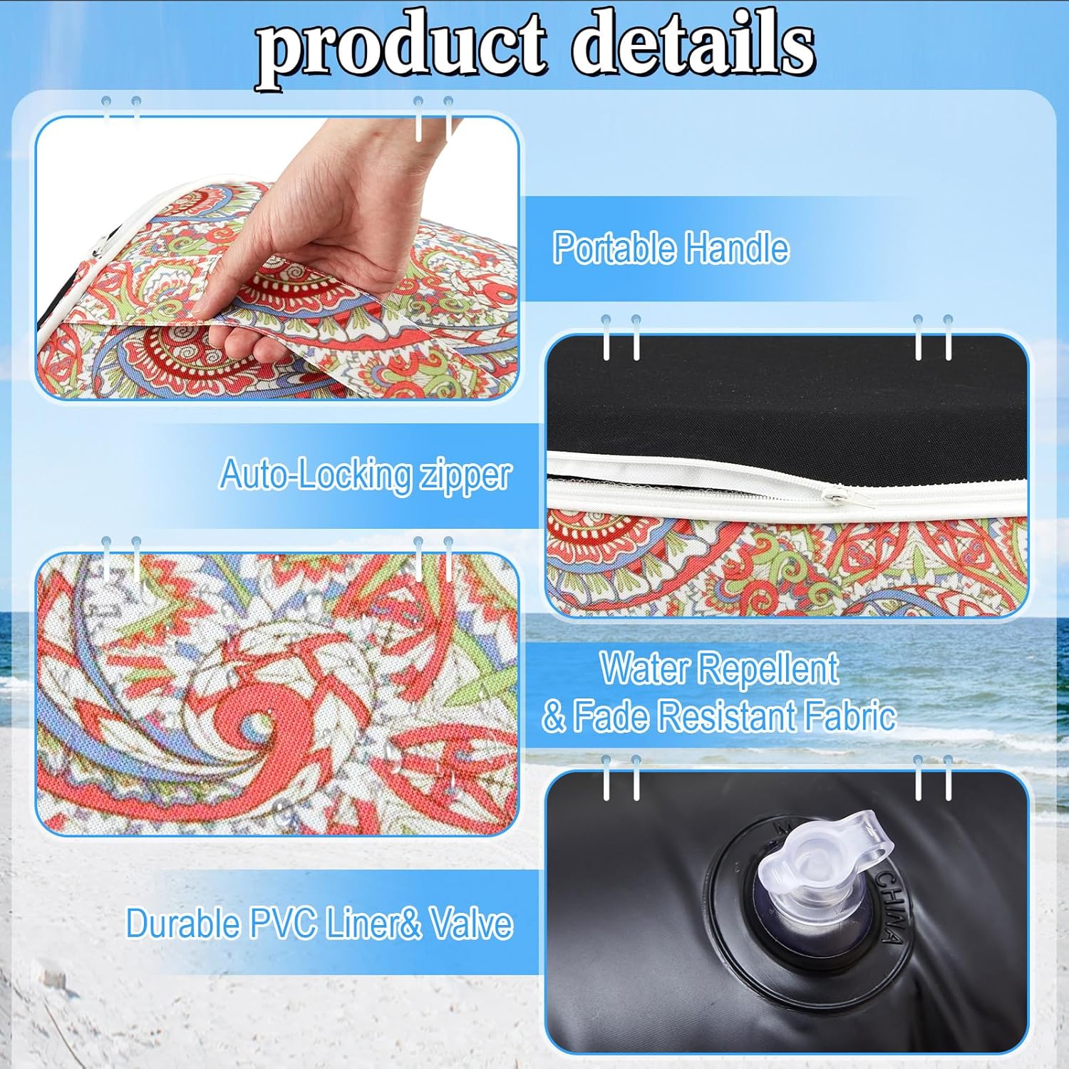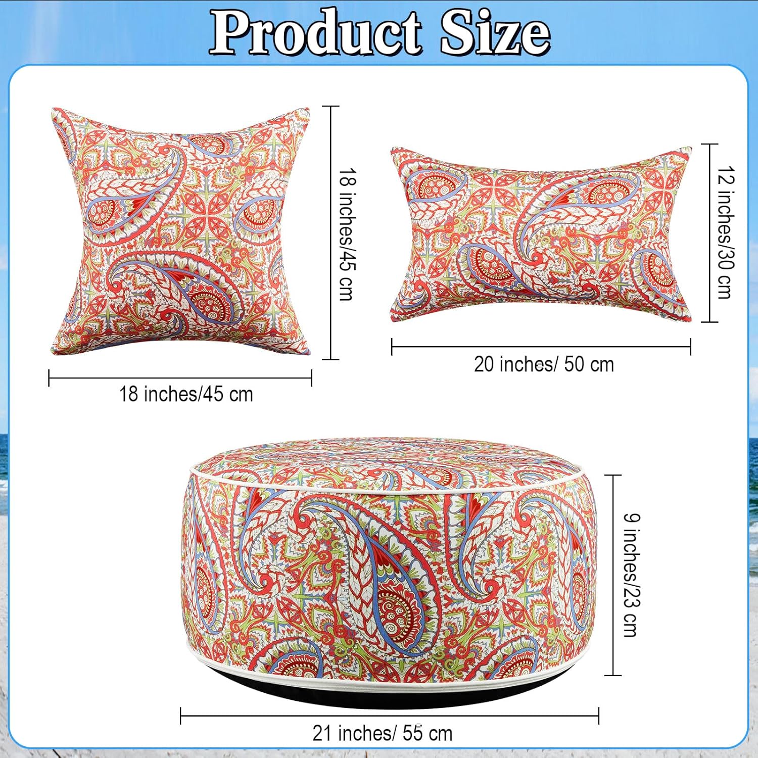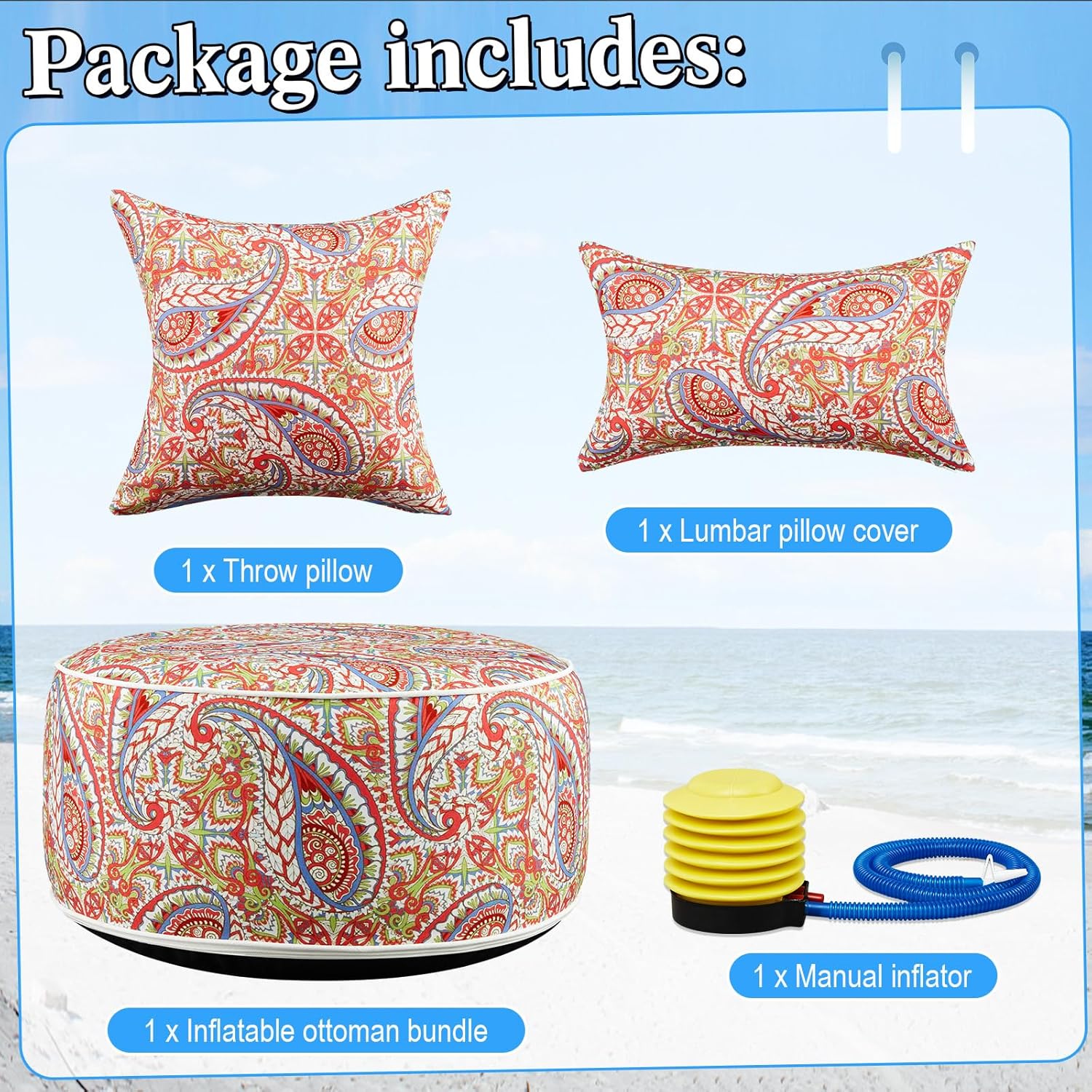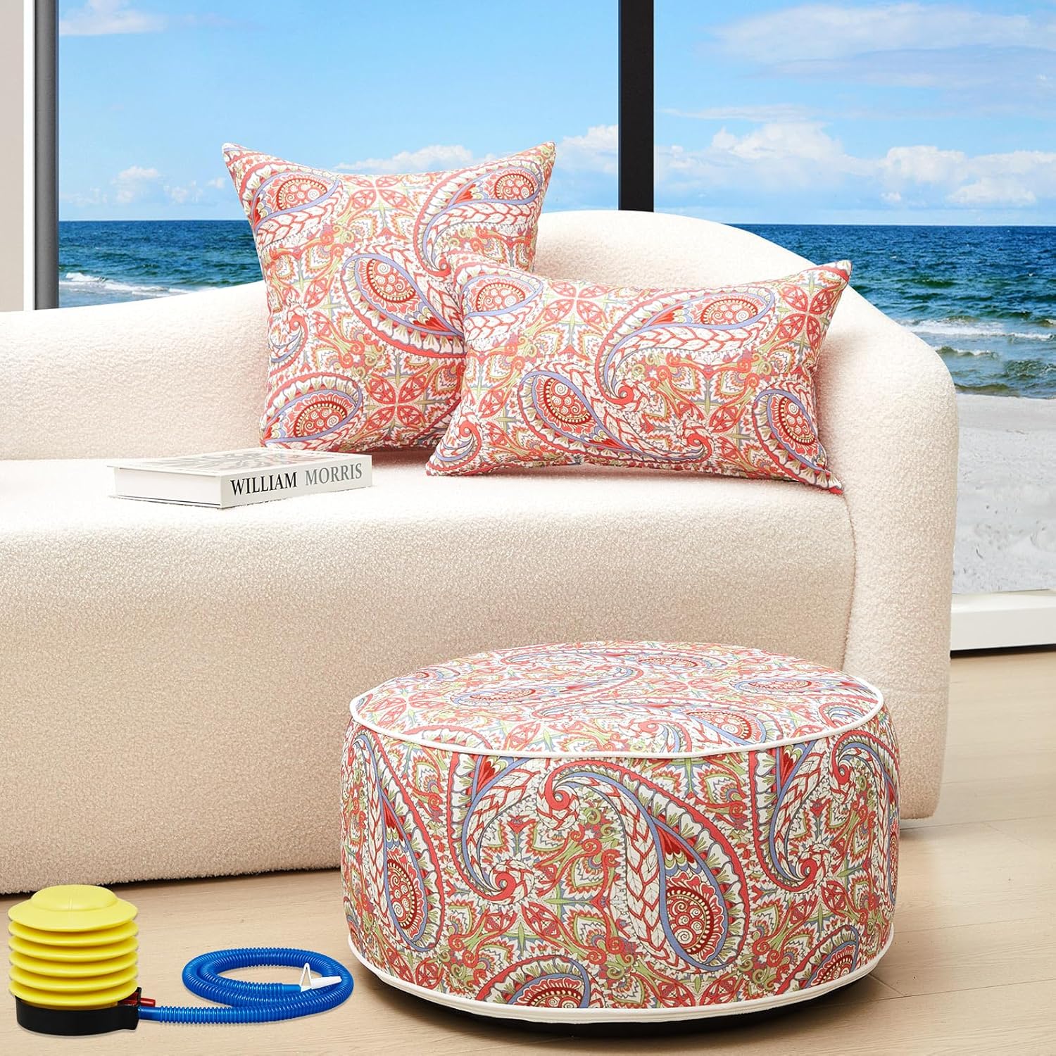 3 Pcs Indoor Outdoor Inflatable Ottoman Inflatable Lumbar Pillow and Toss Pillows, Fade Resistant Round Footrest Stool D21''x H9'', Portable for Patio Garden Camping or Home (Paisley)