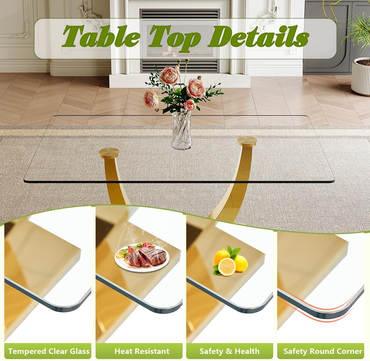 63'' Glass Dining Table Set for 4, Dining Room Table Set for 4, Dining Table with Stainless Steel Leg and Base, PU Dining Chairs (C Style: Glass Gold Table + White Chair, 63'' Table * 4 Chairs)