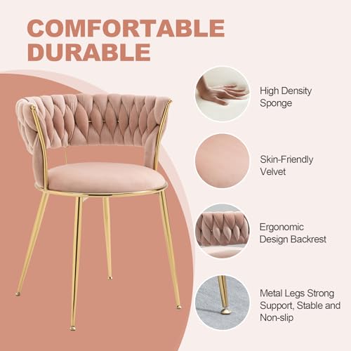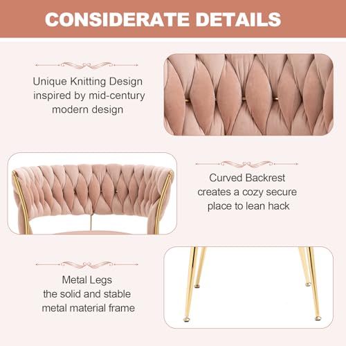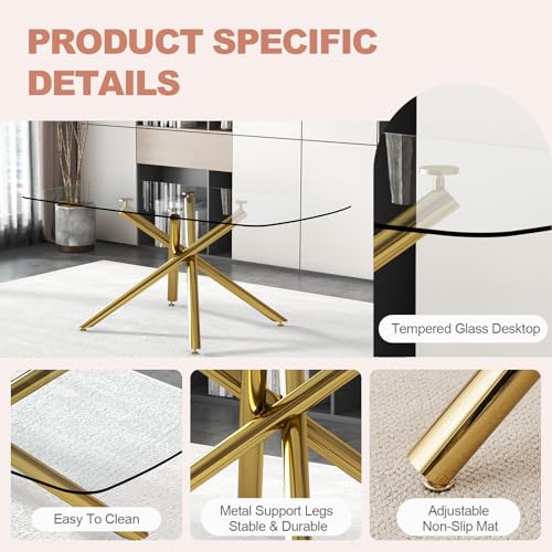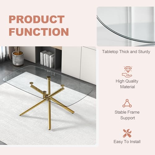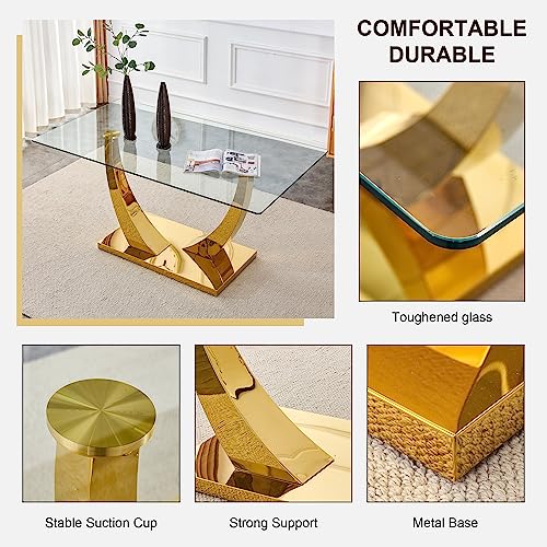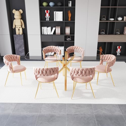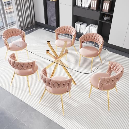 Glass Dining Room Table Set for 6, 71” Modern Rectangular Dinner Table Chair Set with 6 Velvet Upholstered Dining Chairs with Gold Metal Legs, Kitchen Table and Chairs Set for Small Space - Pink