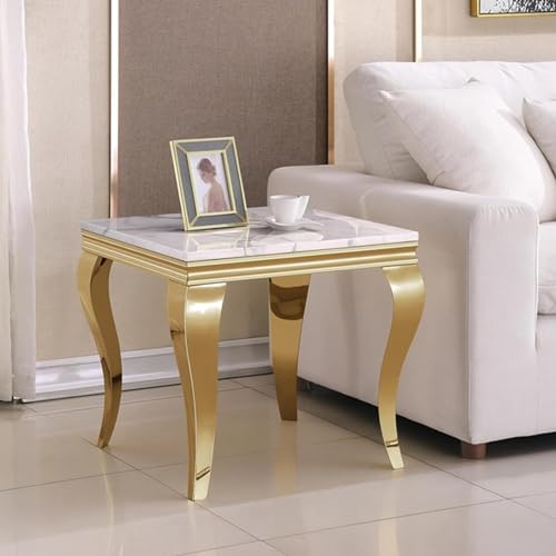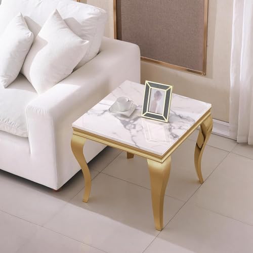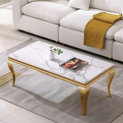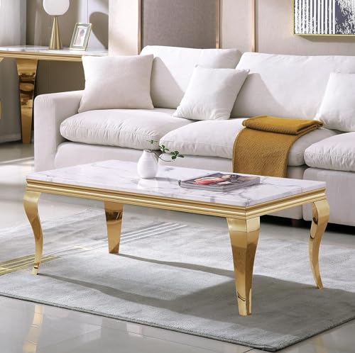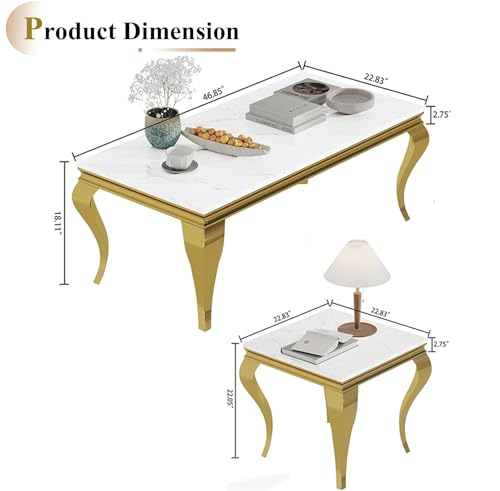 3 Piece Living Room Table Set, Faux Marble Coffee Table and 2 Gold End Tables, Rectangular Modern Luxury Gold Coffee Table Set of 3 with Stainless Steel S-Legs for Apartment, Bedroom
