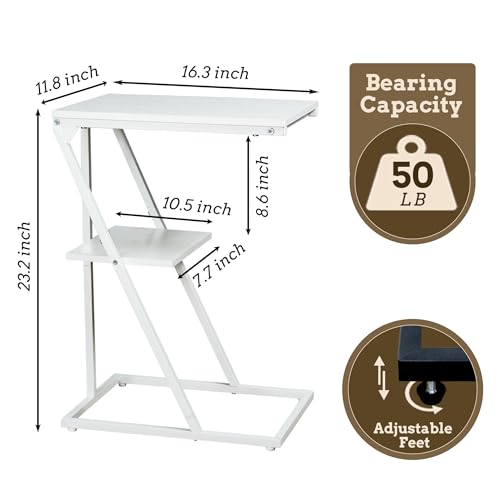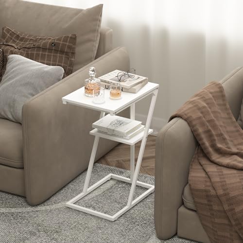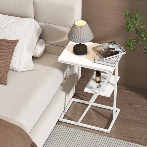 C Shaped End Table Side Table for Couch and Bed Small Couch Side Table with Storage Shelf Slide Under Couch Table for Living Room Bedroom Bedside Small Spaces White