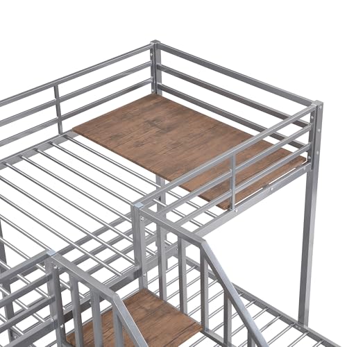 Twin Over Twin Over Twin Triple Bunk Bed, Metal Bunk Bed for 3 with Storage Shelves Staircase & Guardrail, L-Shaped 3 Bunk Beds for Kids Teens Girls Boys No Box Spring Needed/Easy Assemble, Black