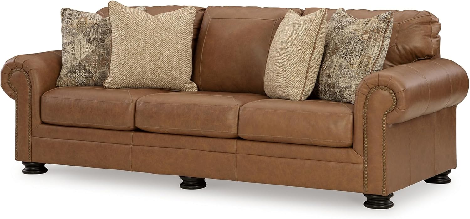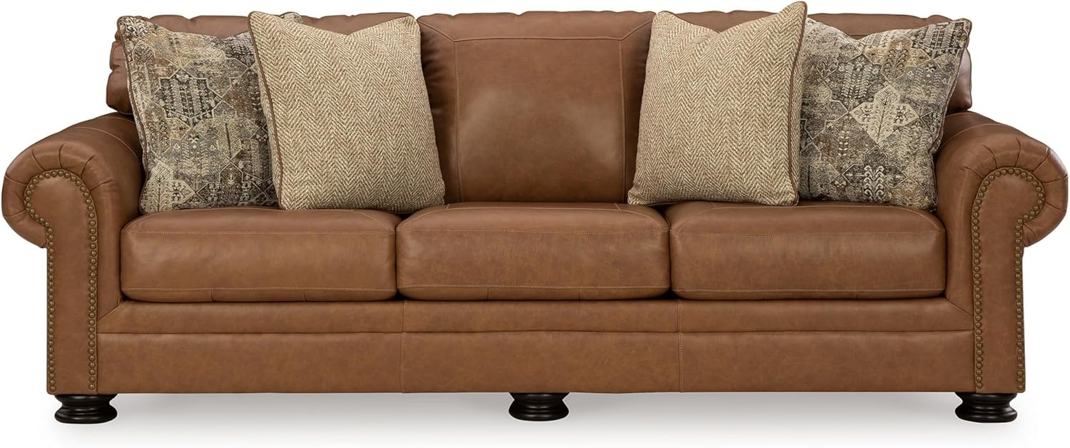 Benjara Riana 101 Inch Sofa, 4 Accent Pillows, Caramel Leather, Brown, Black and Ivory