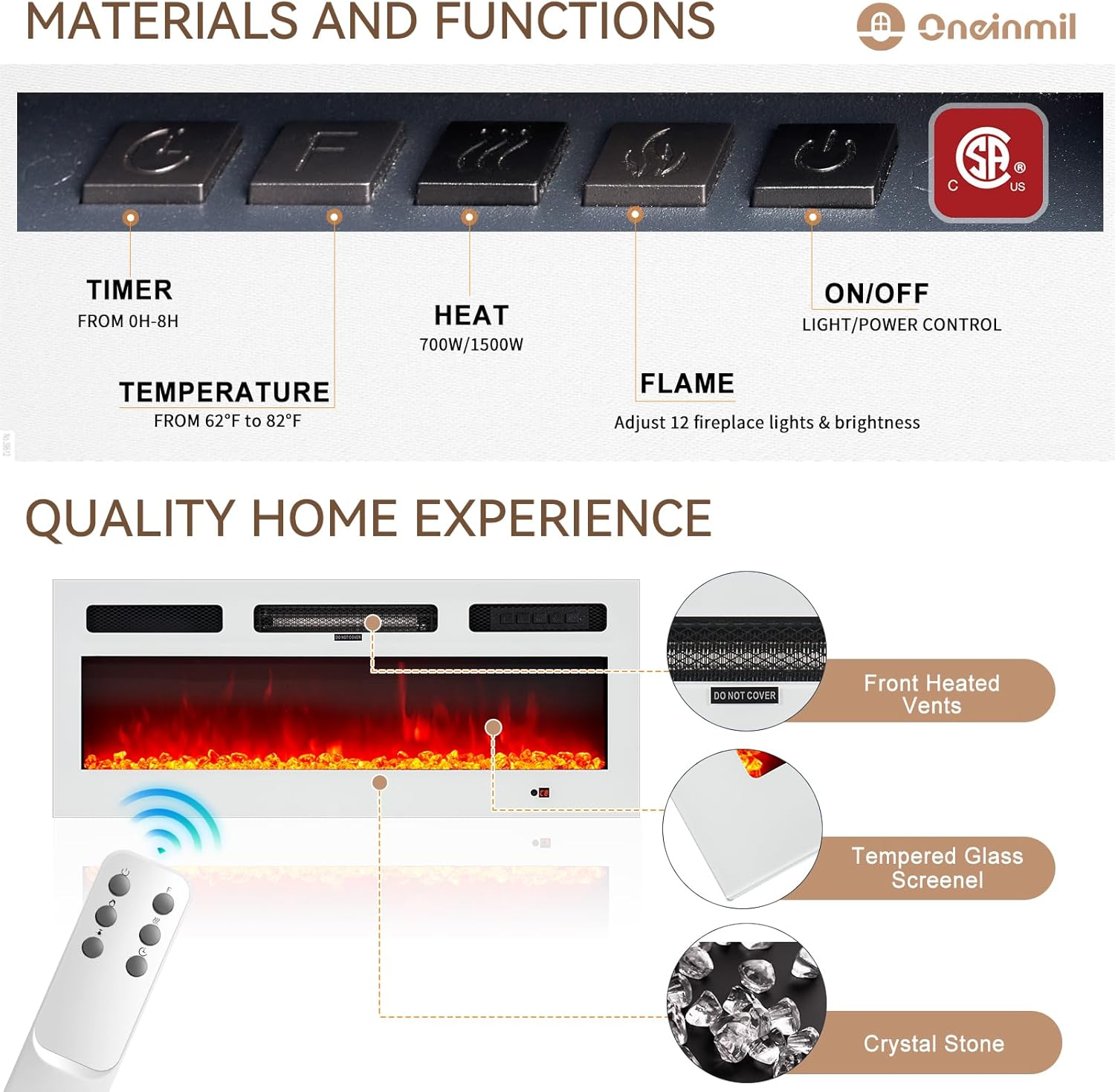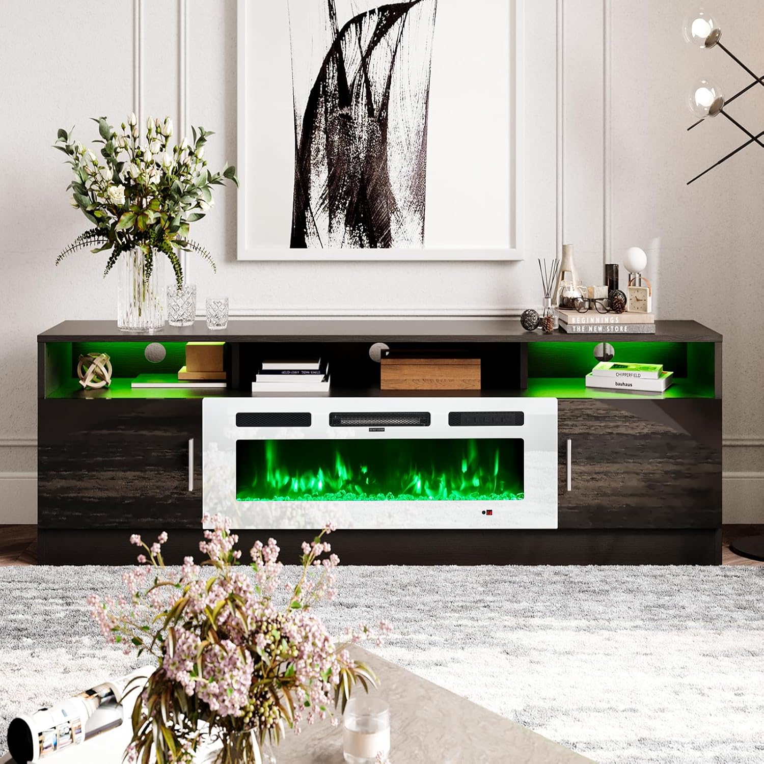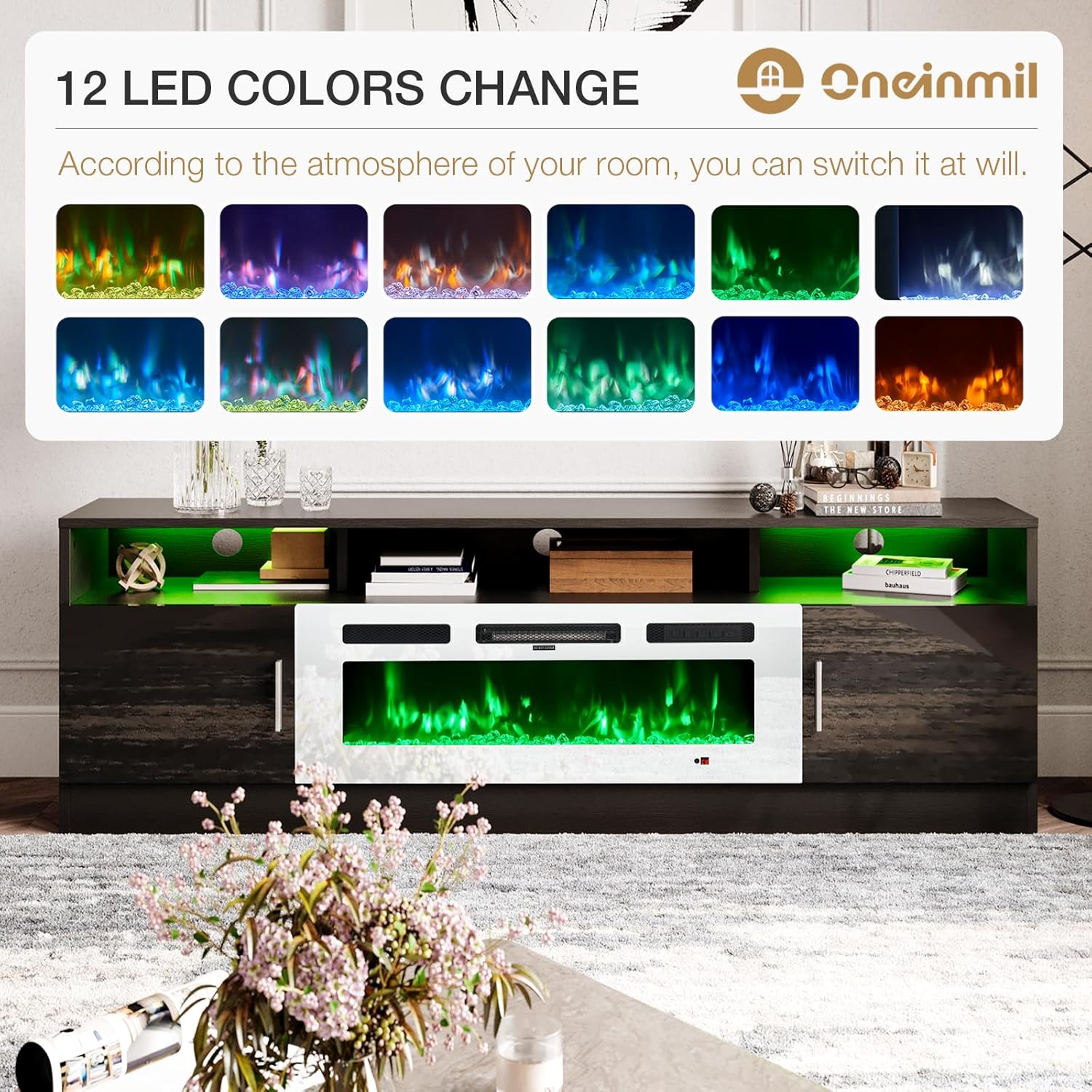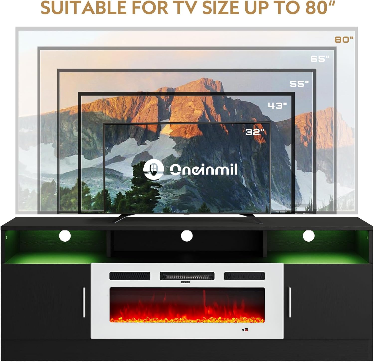 oneinmil 70" Fireplace TV Stand for TVs Up to 80", LED Light Entertainment Center with 36" Fireplace, Storage Cabinet, Media Console Table for Living Room, Black TV Stand and White Fireplace