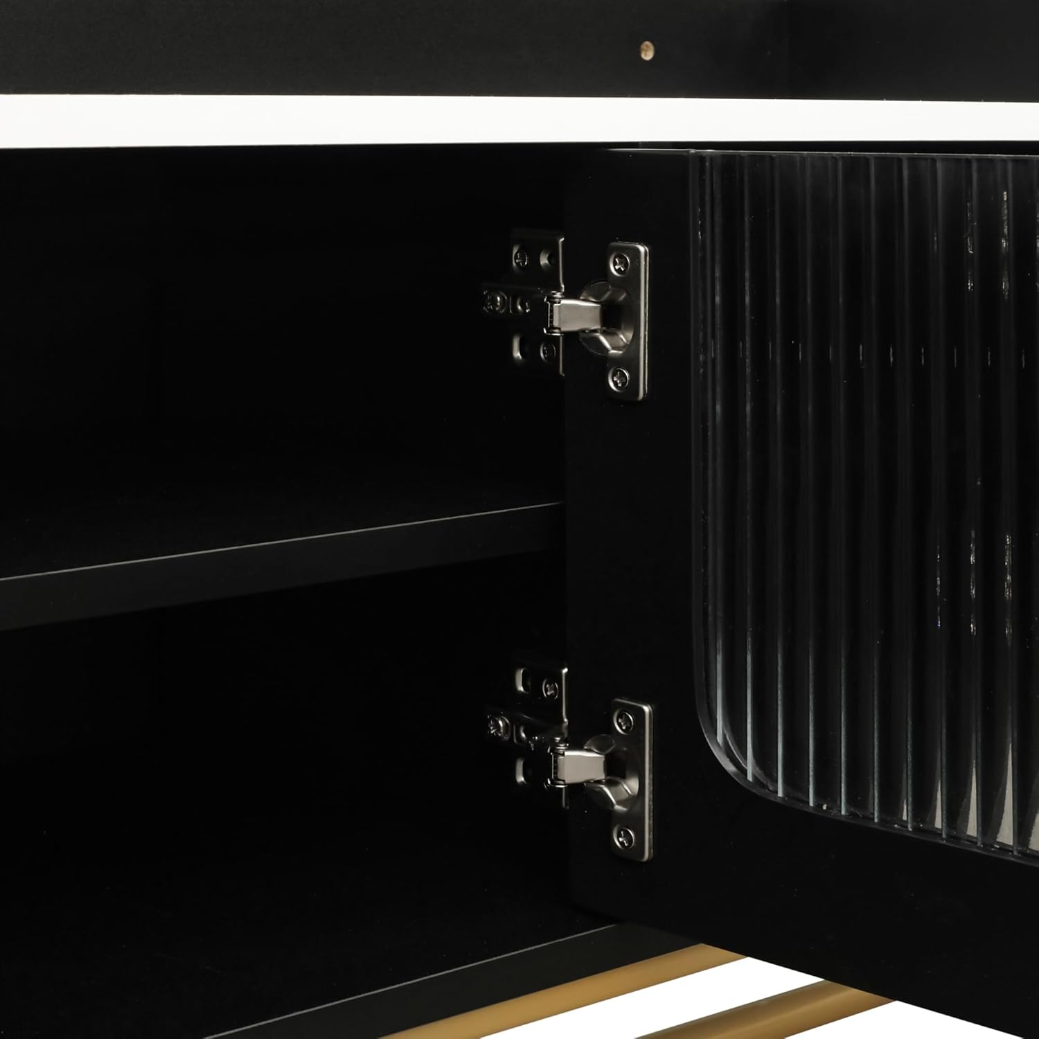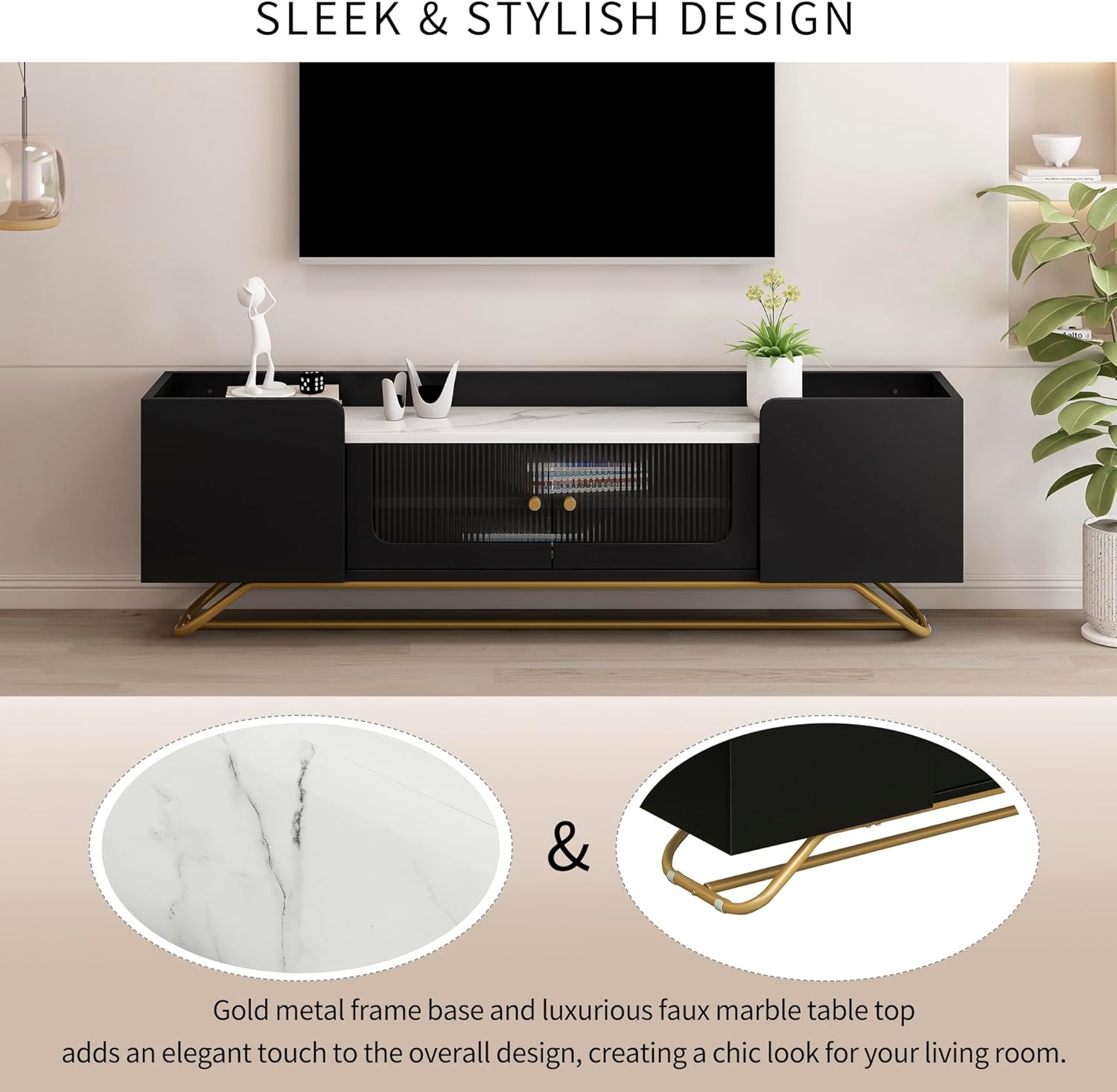 Modern TV Stand with Fluted Glass, Contemporary Entertainment Center Up to 70", Faux Marble Top Media Console Table w/Storage Cabinet and Shelves, Gold Frame Base,for Living Room, Bedroom