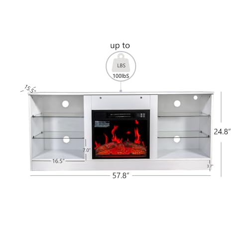 Fireplace TV Stand with 18 Inch Electric Fireplace Heater,Modern Entertainment Center for TVs up to 62 Inch with Adjustable Glass Shelves and Storage Cabinets (White)