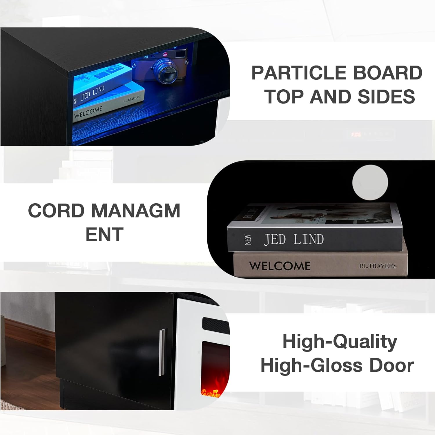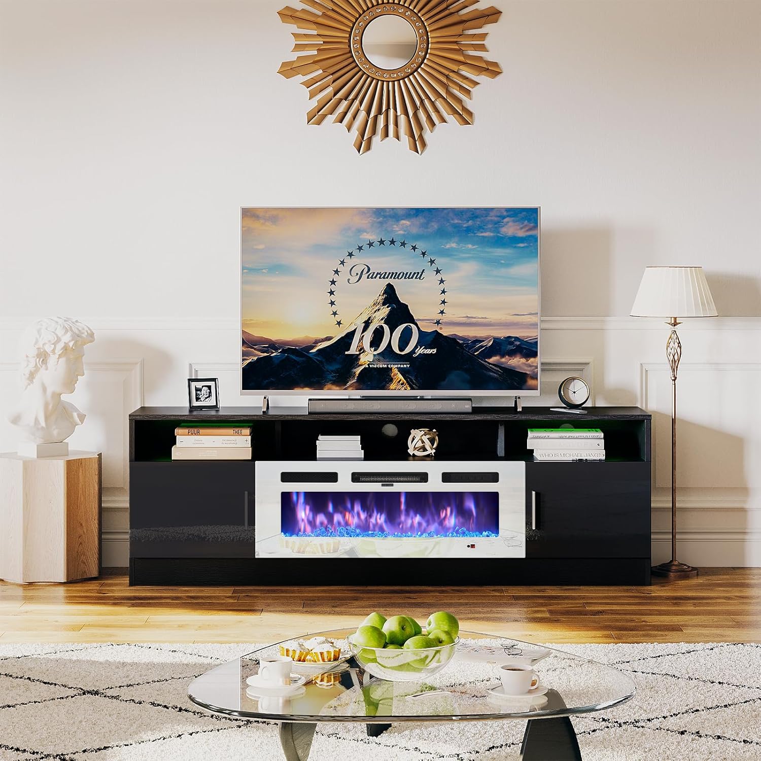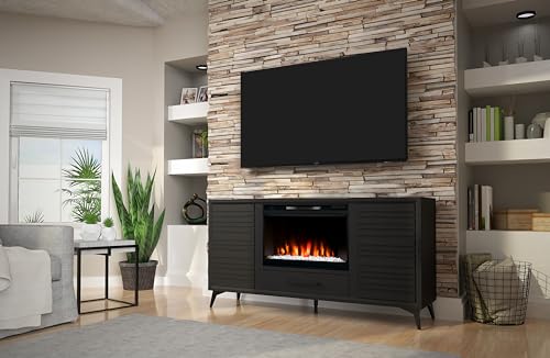 Realcozy Malibu Contemporary TV Stand Entertainment Center with Fireplace, 78 inches, Accommodates TVs up to 90 inches, Fully Assembled, Poplar Solid Wood, Charcoal Black Finish