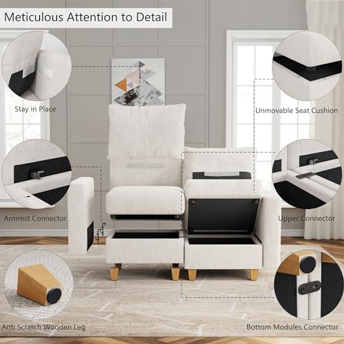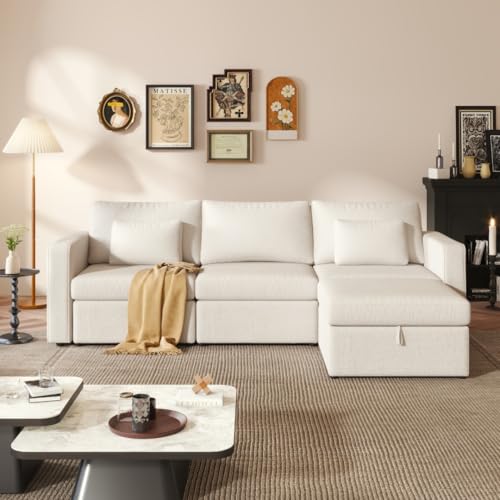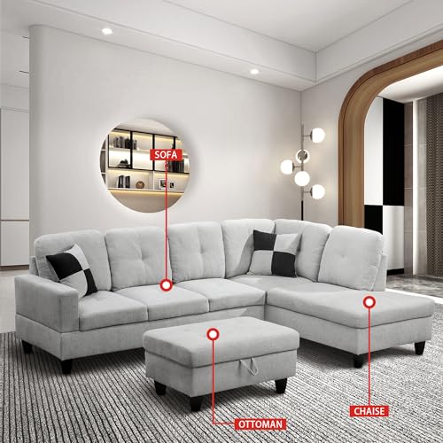 RITSU 3 Piece L Shaped Sectional Sofa Set with Storage Ottoman, Right Facing Chaise Longue, Reversible Backrest w/ 2 Cup Holders, Flannel Tufted Cushions, for Living Room, Off White, 103inch