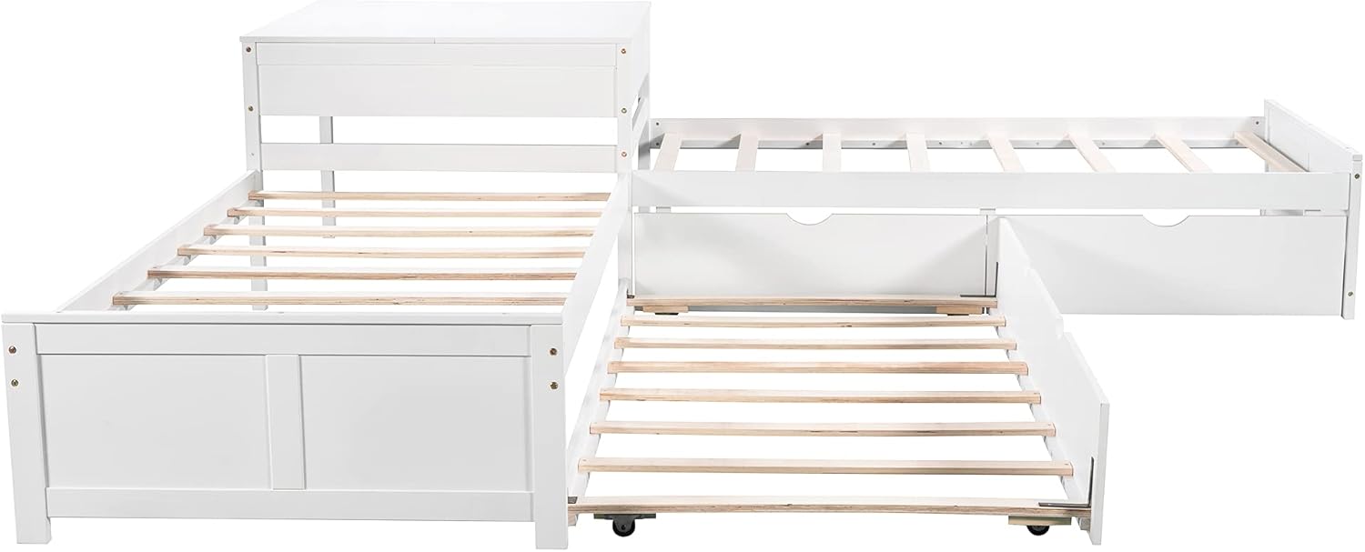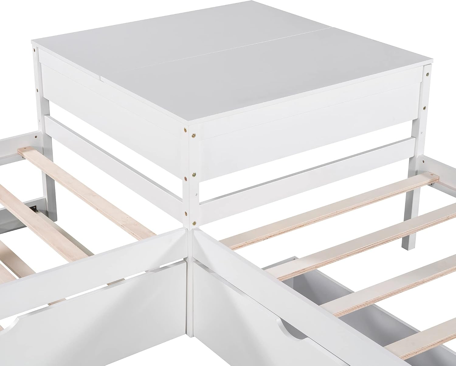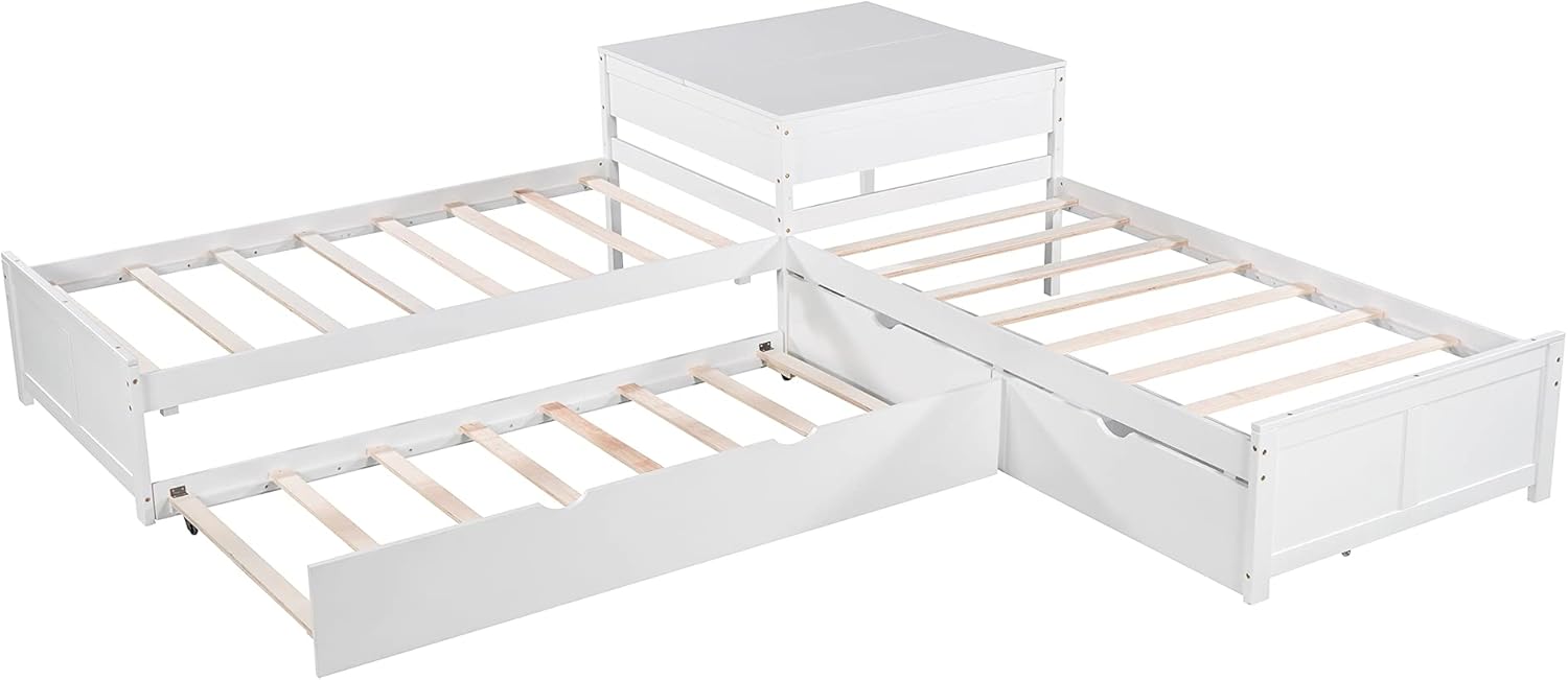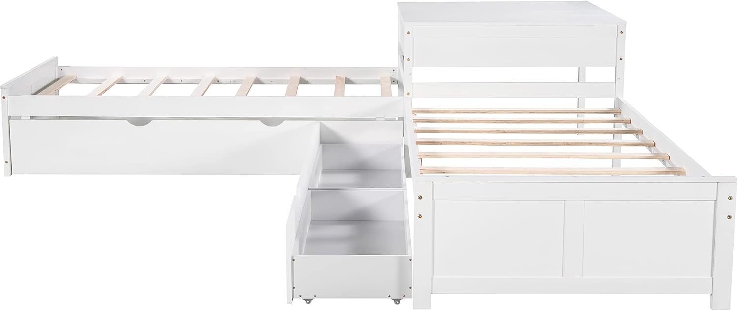 Twin Size L-Shaped Bed with Storage Drawers, Trundle and Corner Table for Kids, White