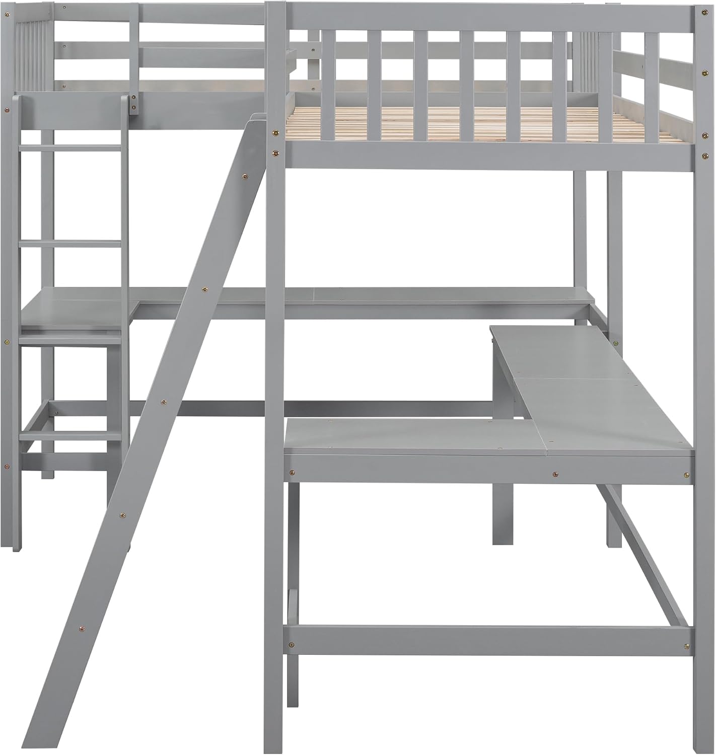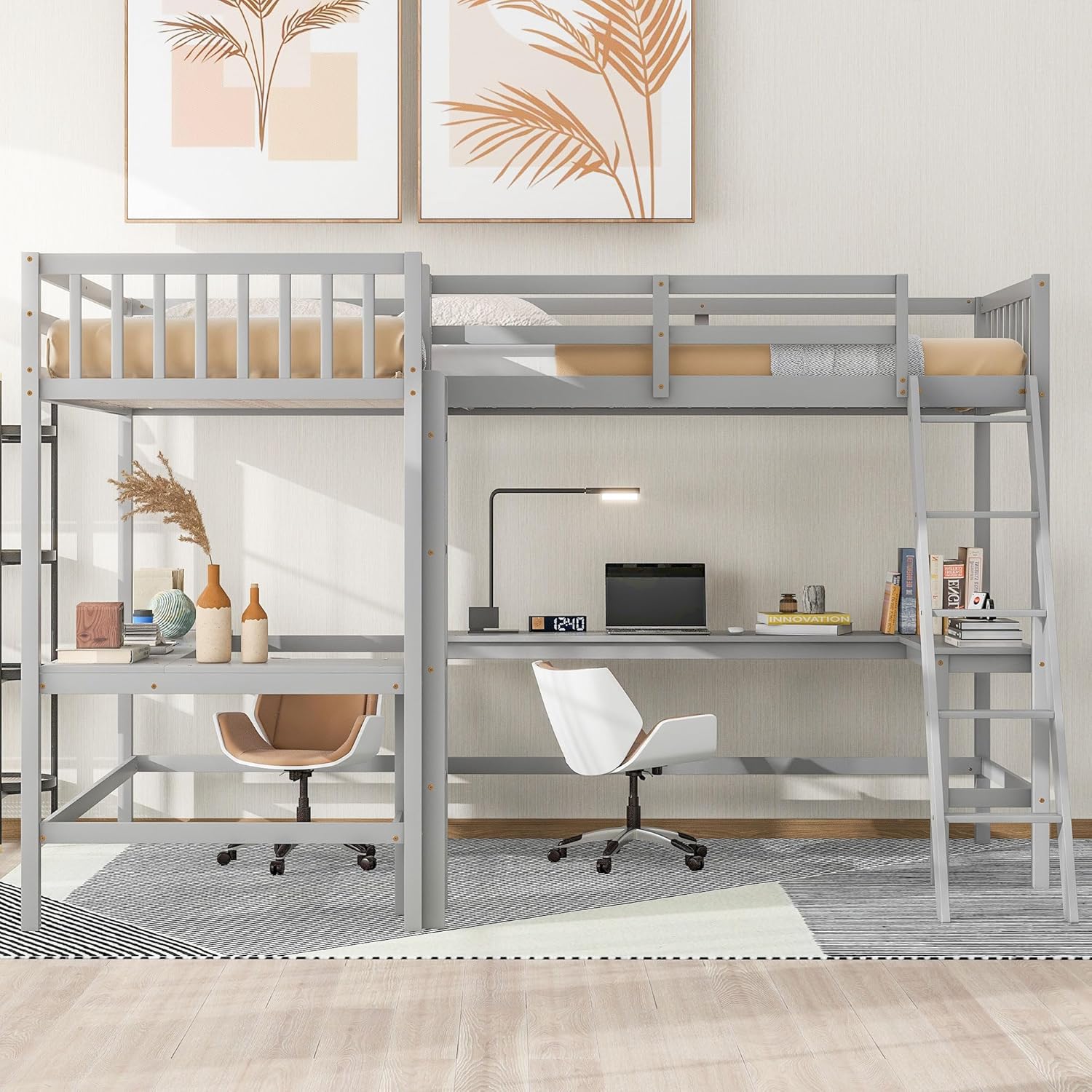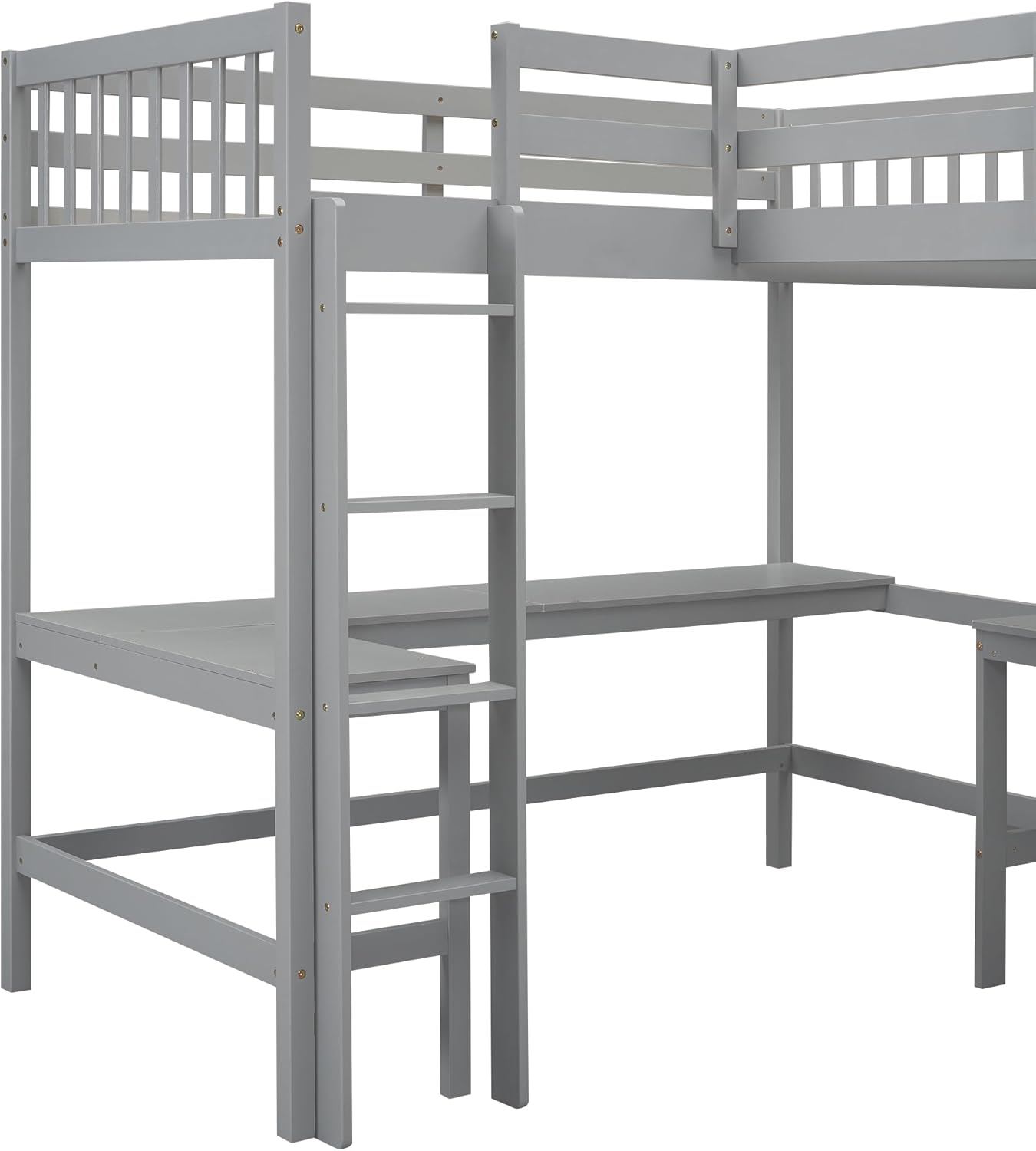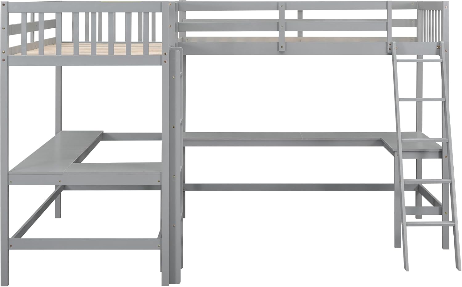 L-Shaped Loft Bed with Two Ladder and 2 Built-in L-Shaped Desks,Wood Twin Size Corner Loft Bed Frame with Full-Length Guardrails,2 Beds in 1 Design,No Box Spring Required,Gray