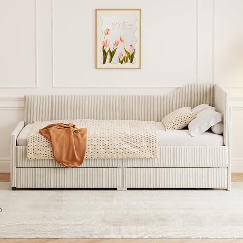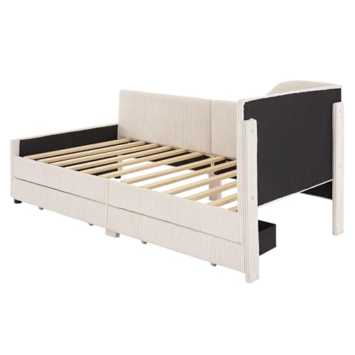 Twin Size Corduroy Daybed,Modern Twin L-Shaped Daybed with 2 Storage Drawers,L-Shaped Sapce Saving Corner Sofabed,Wood Slat Support,No Box Spring Needed,Pink