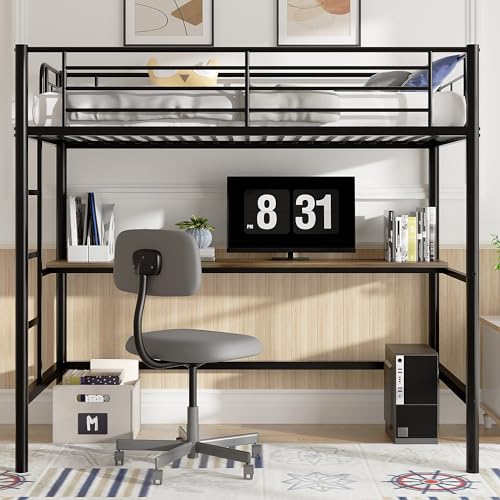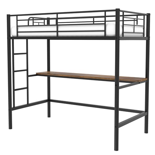 VECELO Loft Bed Twin Size with Desk, Metal Bedframe with Removable Ladder and Safety Guardrail, No Box Spring Needed, Space Saving, Noise Free, Black