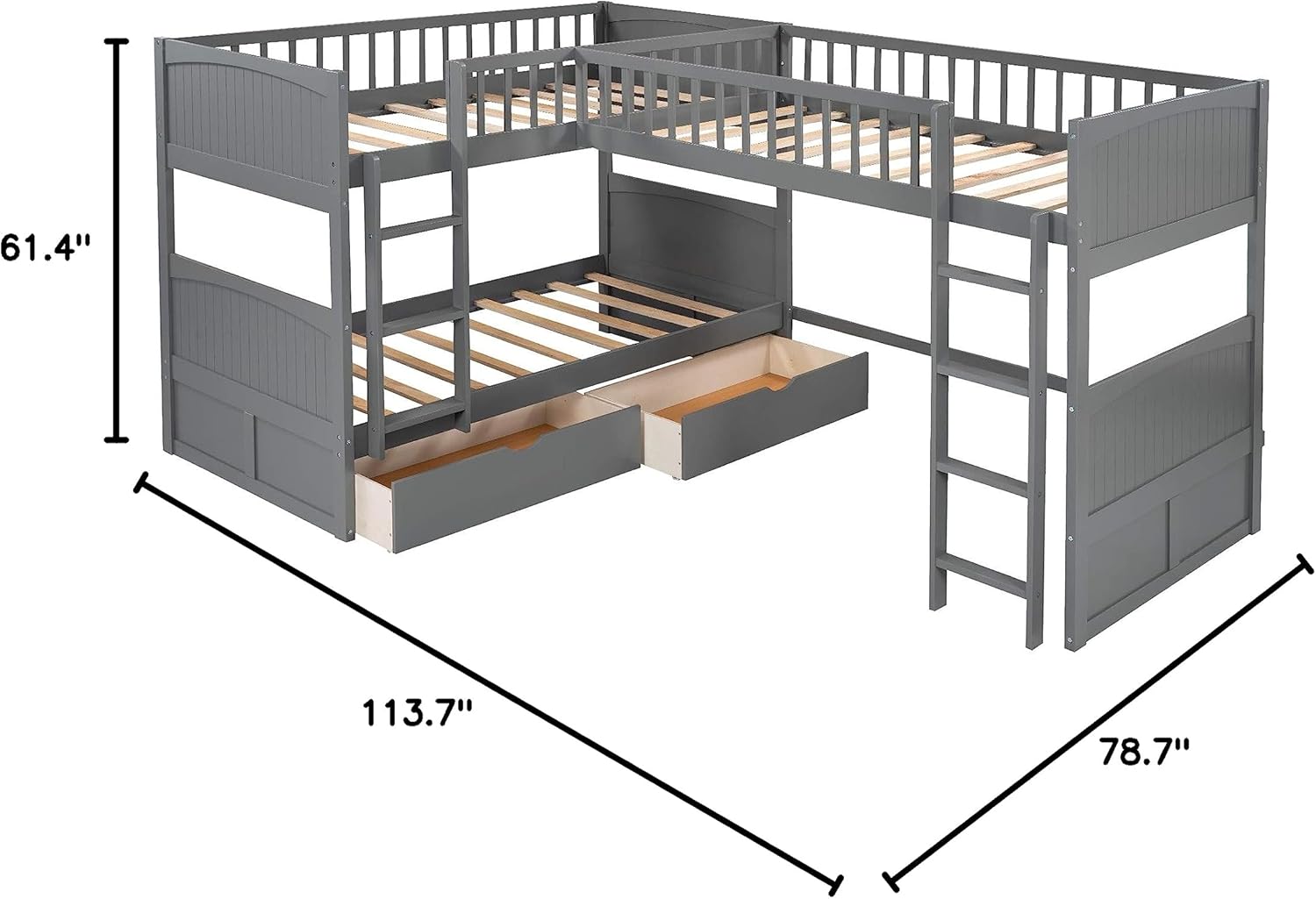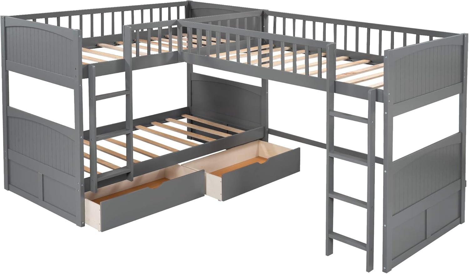 Merax L-Shaped Solid Wood Bunk Bed, Twin Over Twin Over Twin Bed with 2 Drawers and 2 Ladders, Twin Size Bunk Bed with a Loft Bed Attached, Grey